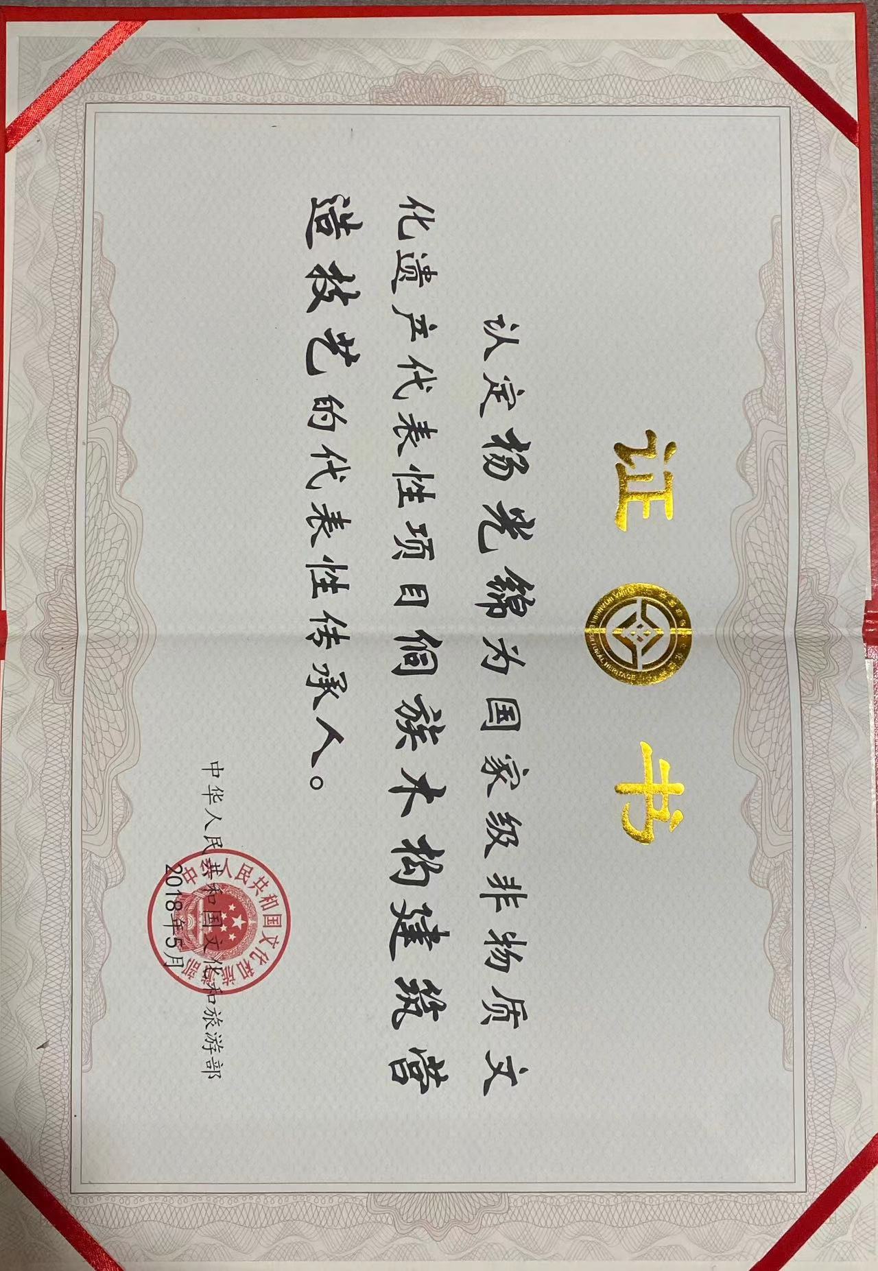 杨光锦  1942 年 生 大儿 杨昌盛 小儿子 杨昌贵,杨光锦(1943年6月—),侗族从江县高增乡高增村人,侗族木构建筑营造技艺国家级非物质文化遗产代表性传承人,当地著名掌墨师。主持修建维修鼓楼风雨桥30余座及侗族民居近300栋,采用竹制“匠杆”竹尺和独特设计符号实现榫孔层叠交错工艺。2010年被贵州省文化厅评为省级非物质文化遗产代表性项目侗族木构建筑营造技艺的代表性传承人,2018年5月获文化和旅游部认定为国家级非物质文化遗产代表性项目侗族木构建筑营造技艺的代表性传承人
