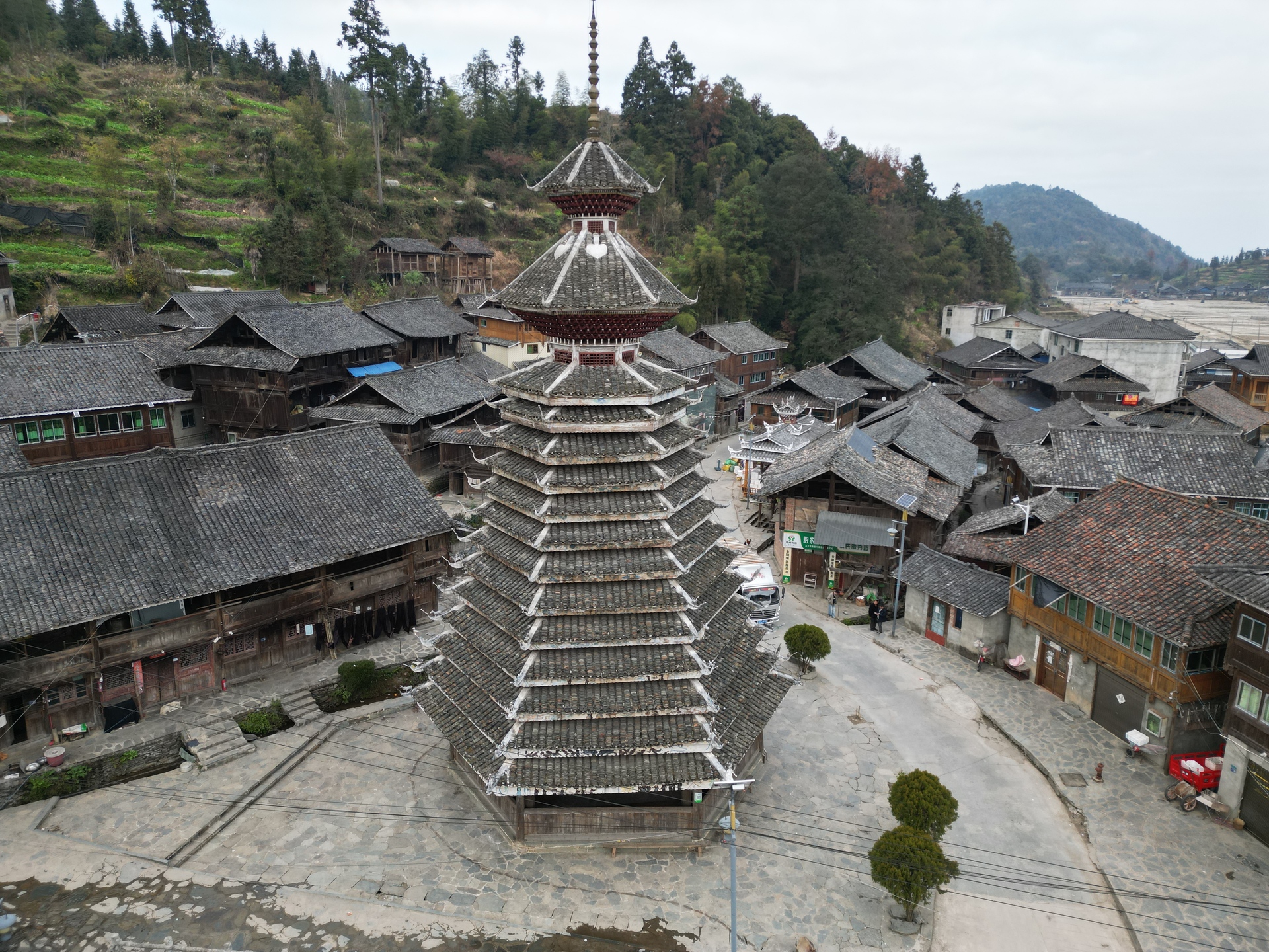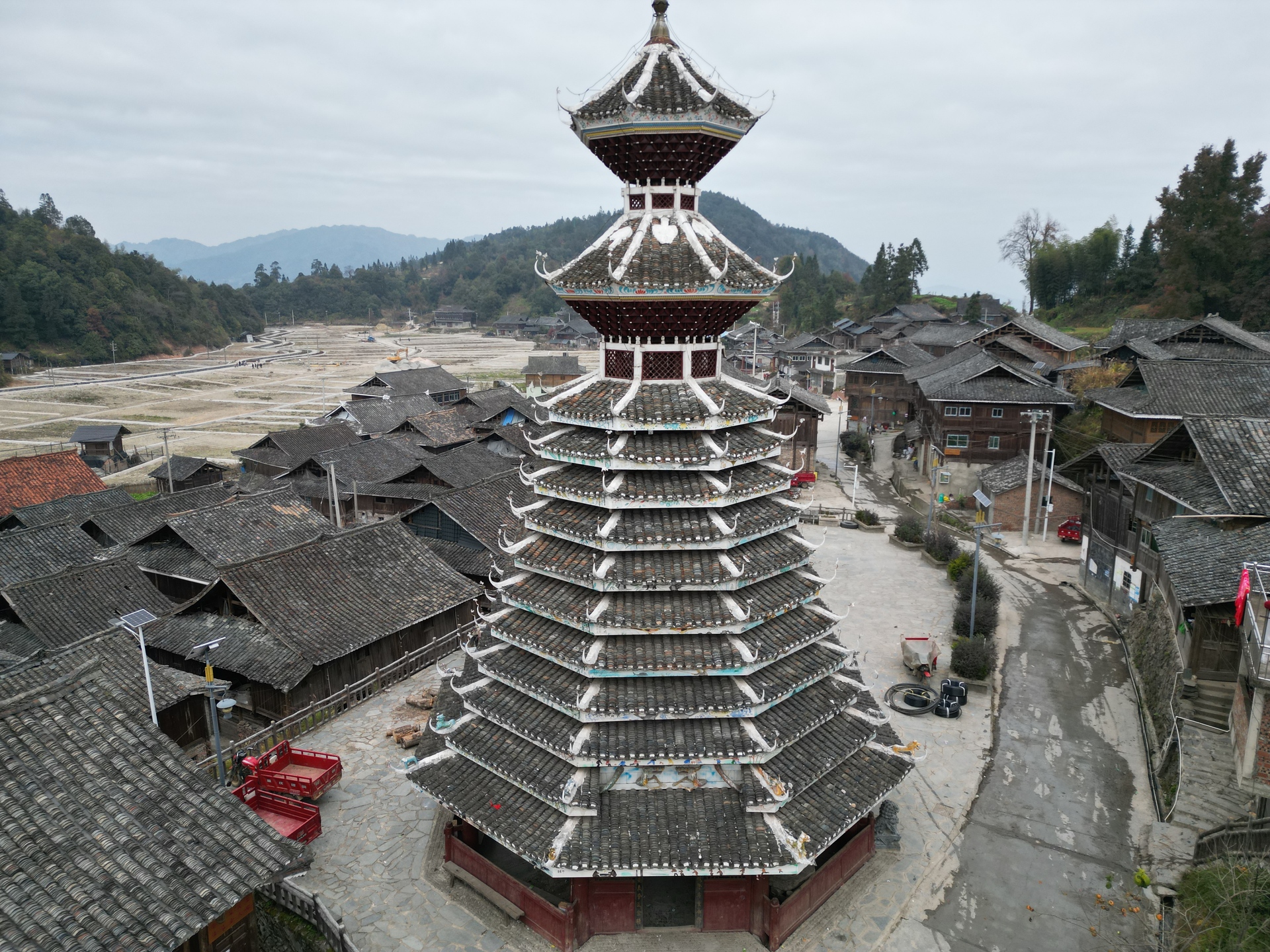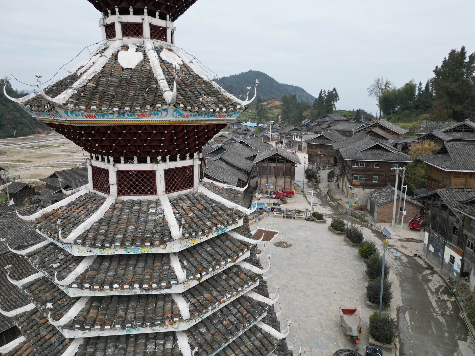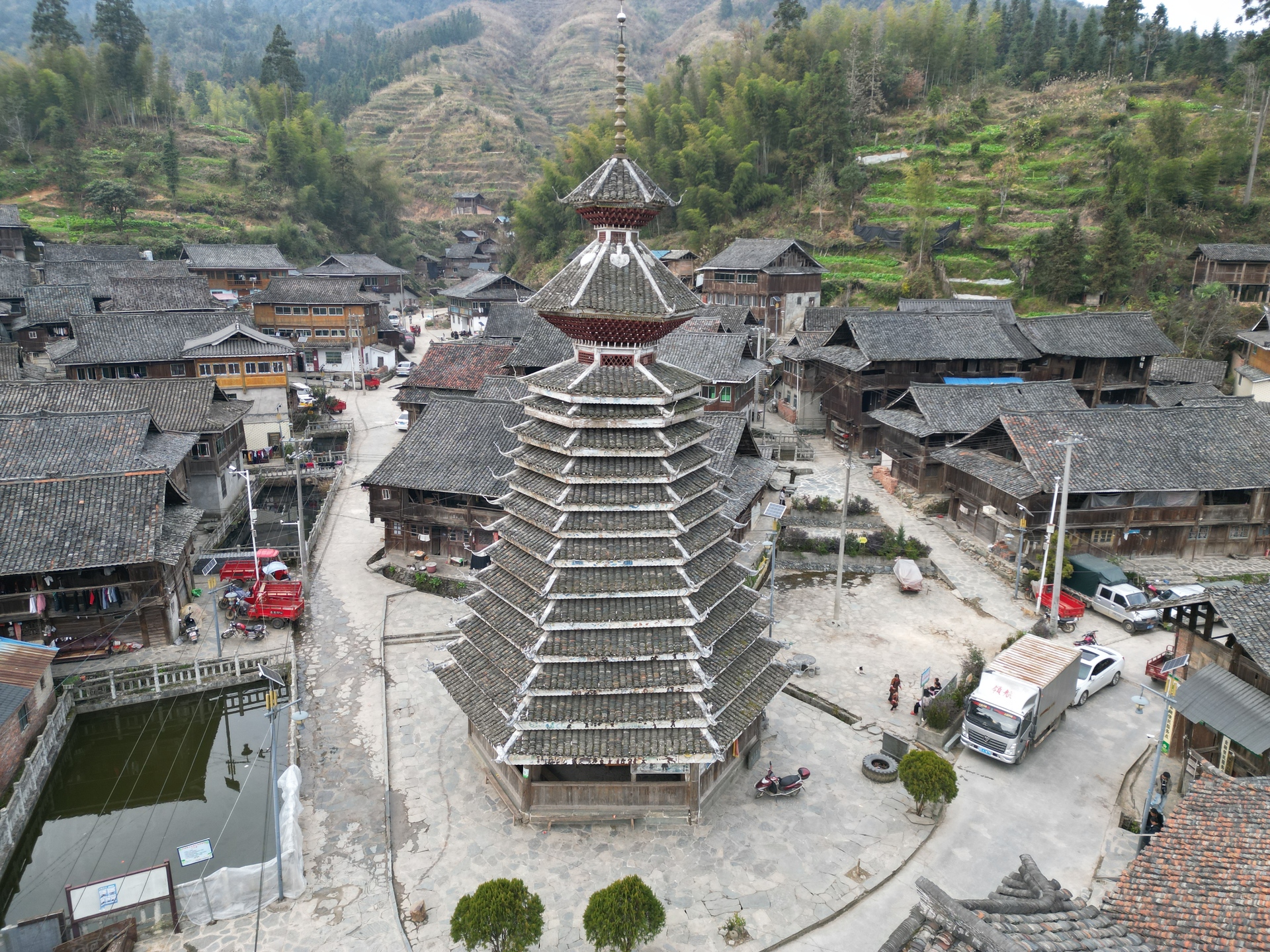 始建于清雍正年间的国家级重点文物保护单位鼓楼,其全木质结构采用卯工艺建造体现侗族建筑艺术特征1-3。村内民居以杉