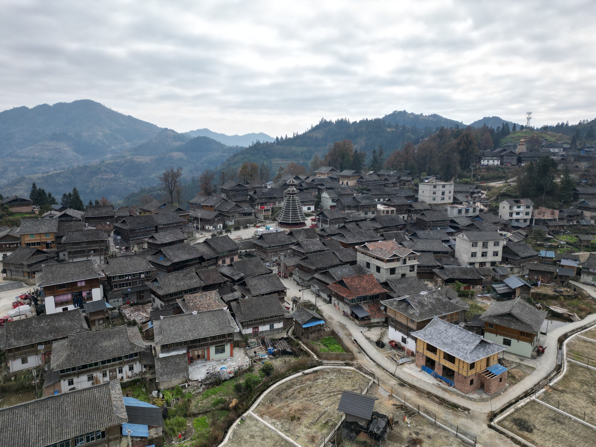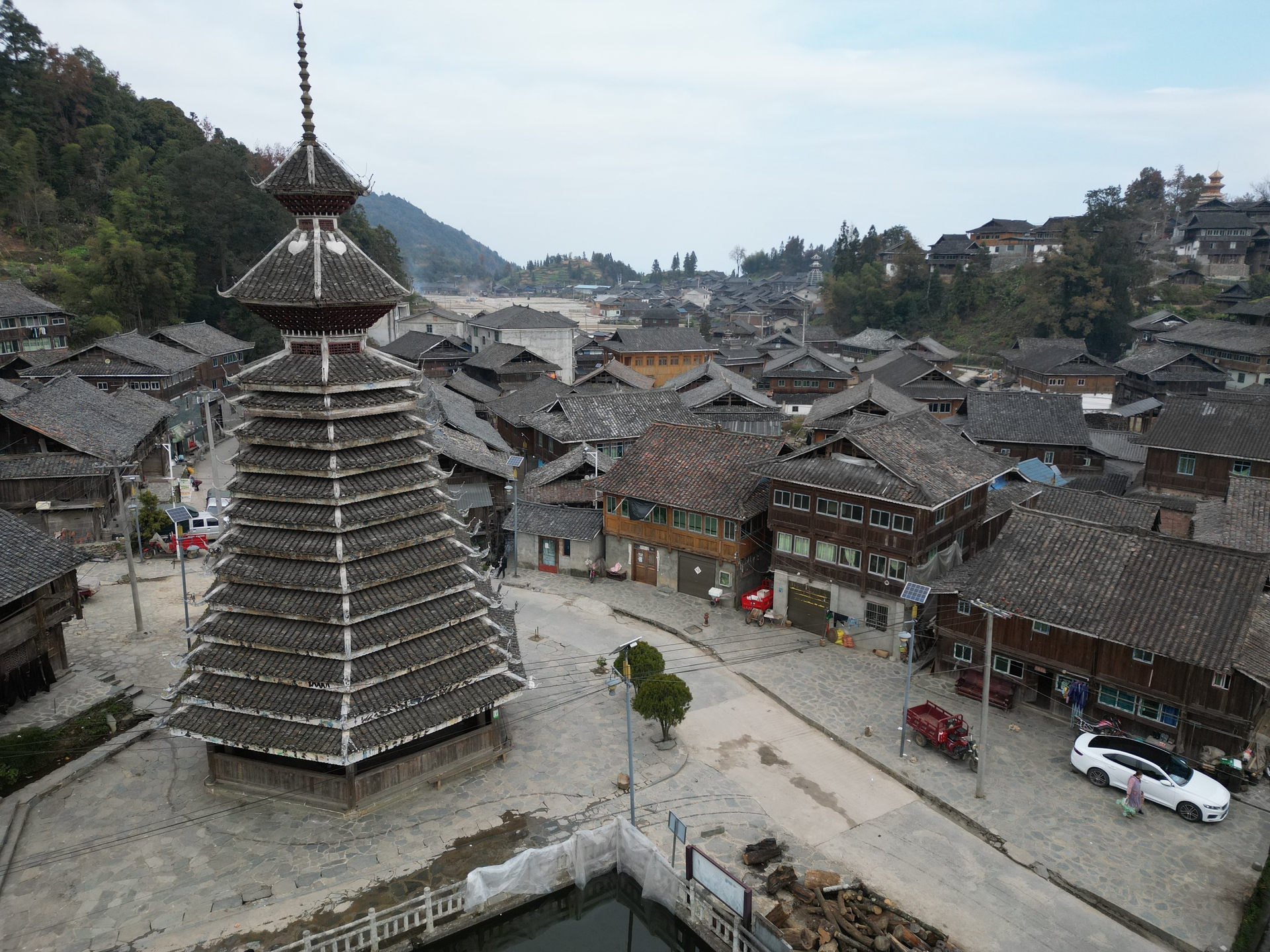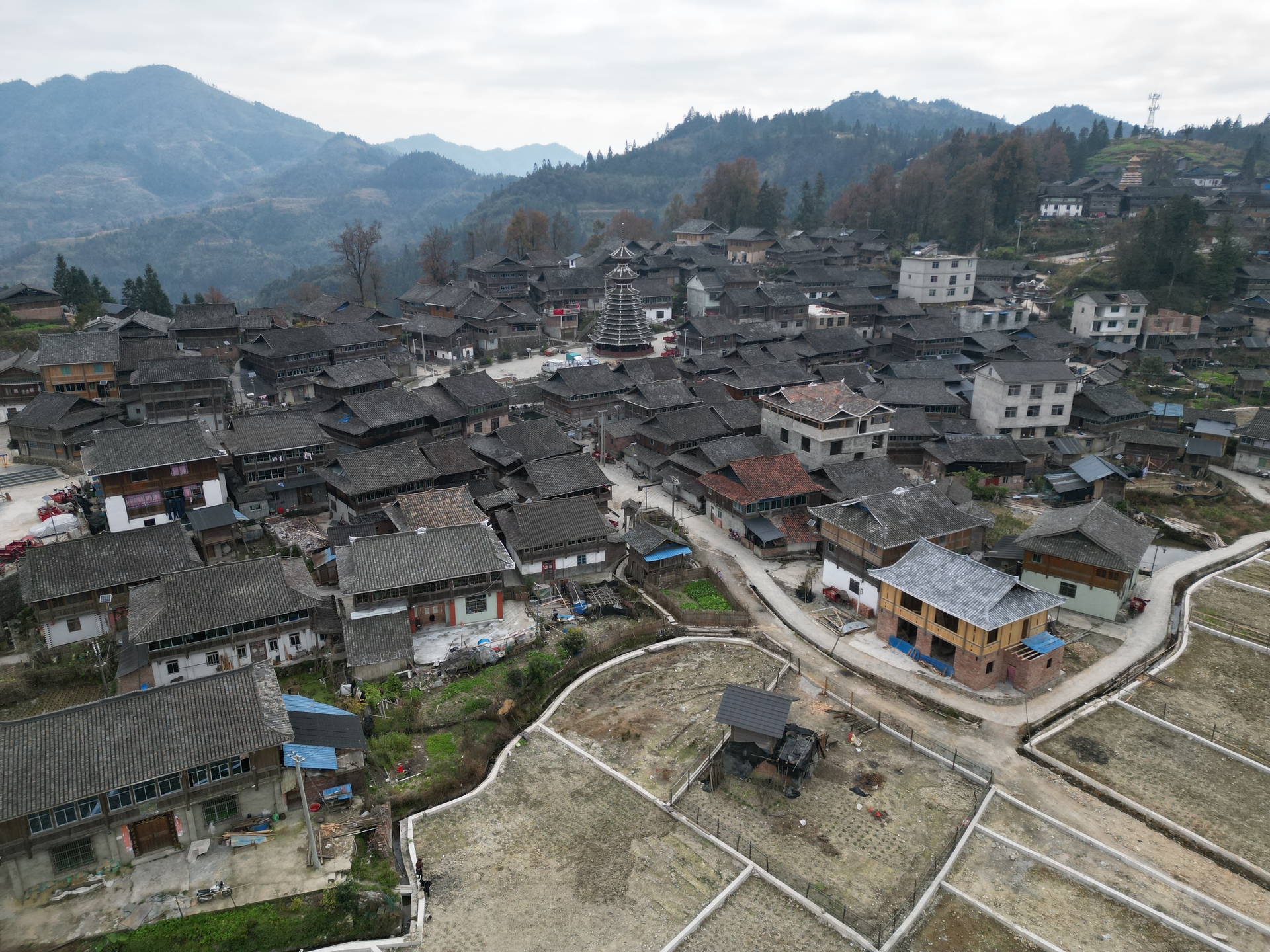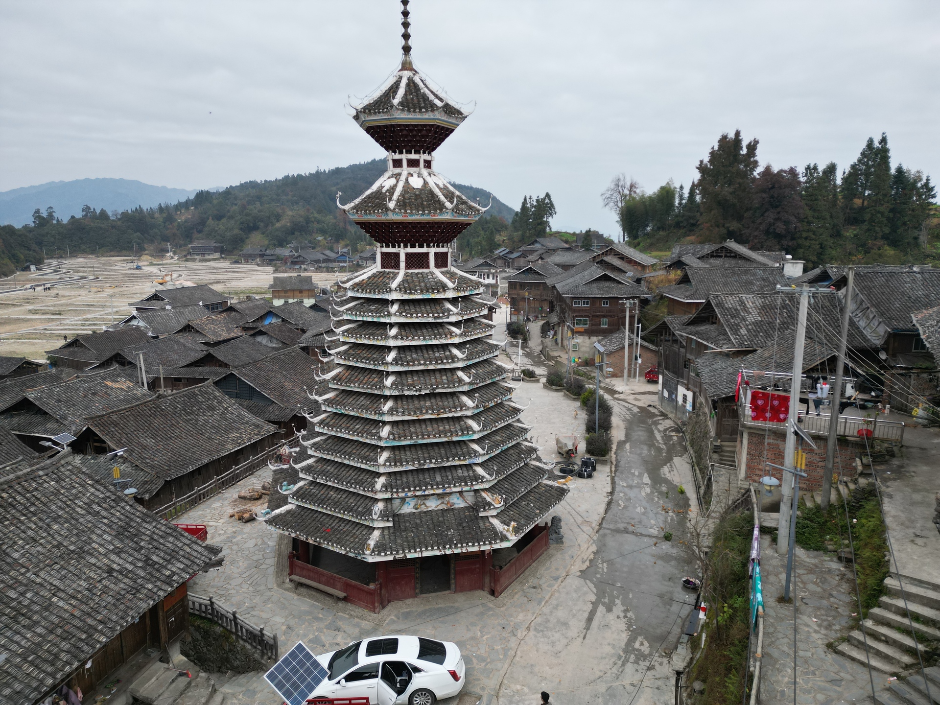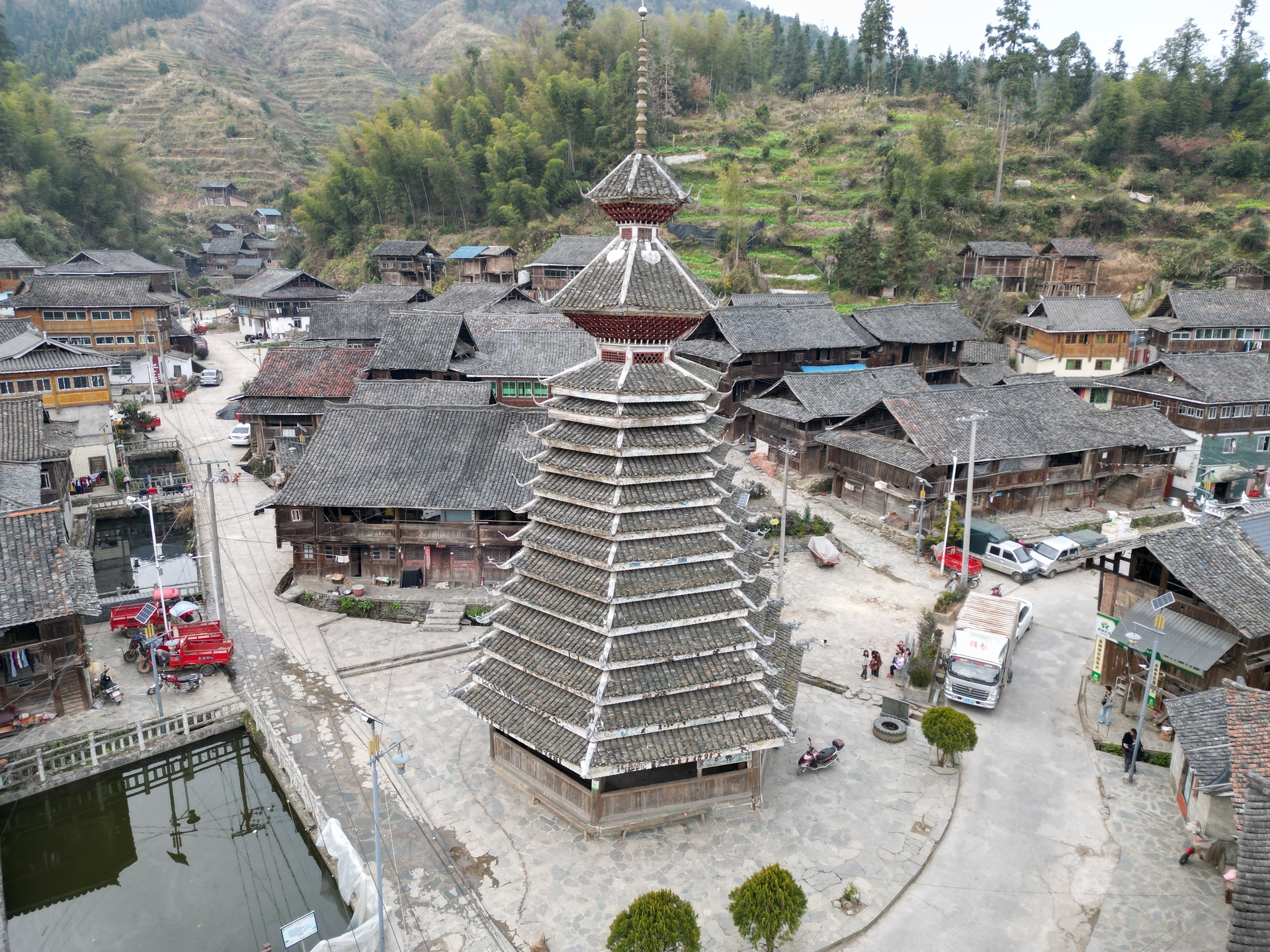始建于清雍正年间的国家级重点文物保护单位鼓楼,其全木质结构采用卯工艺建造体现侗族建筑艺术特征1-3。村内民居以杉