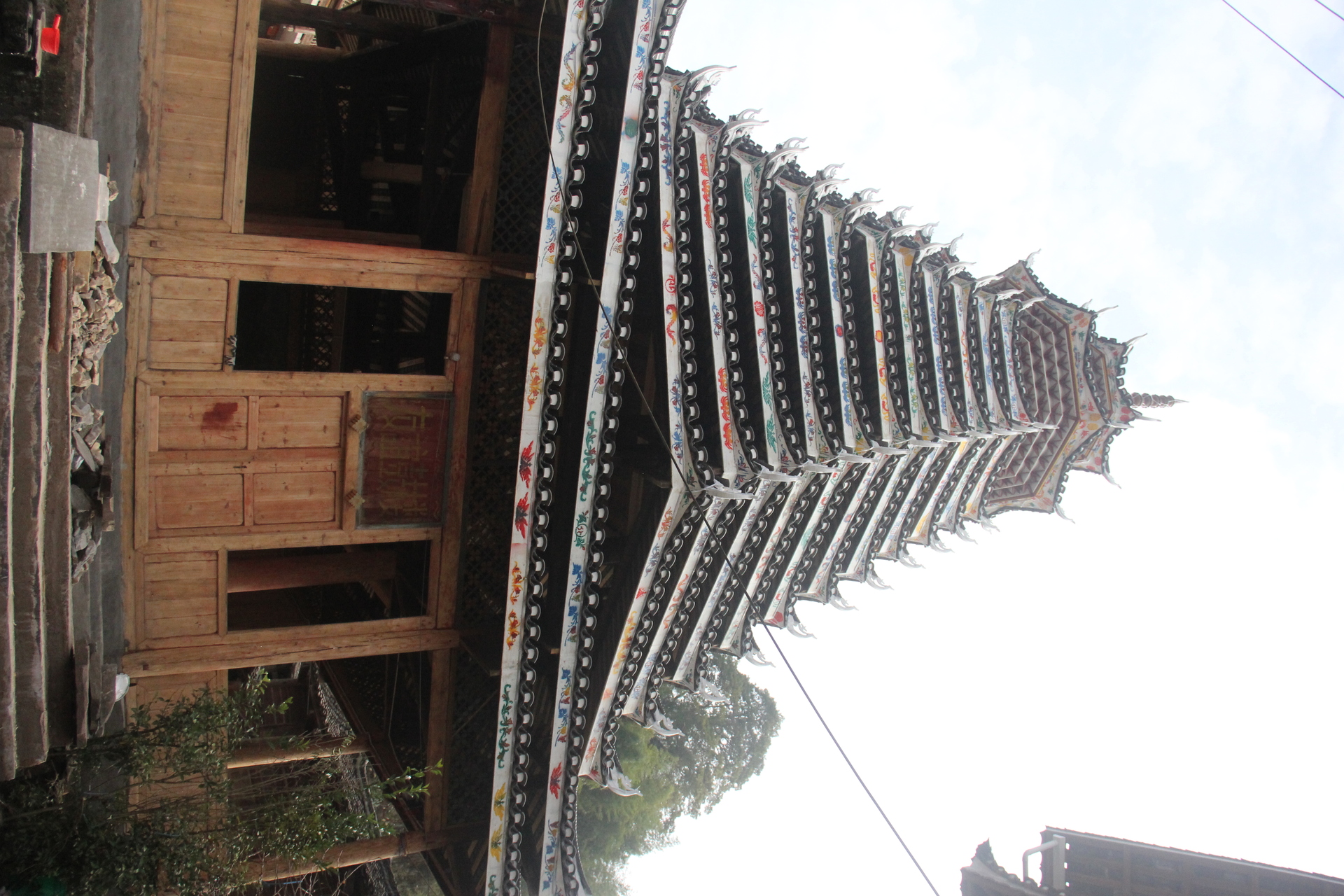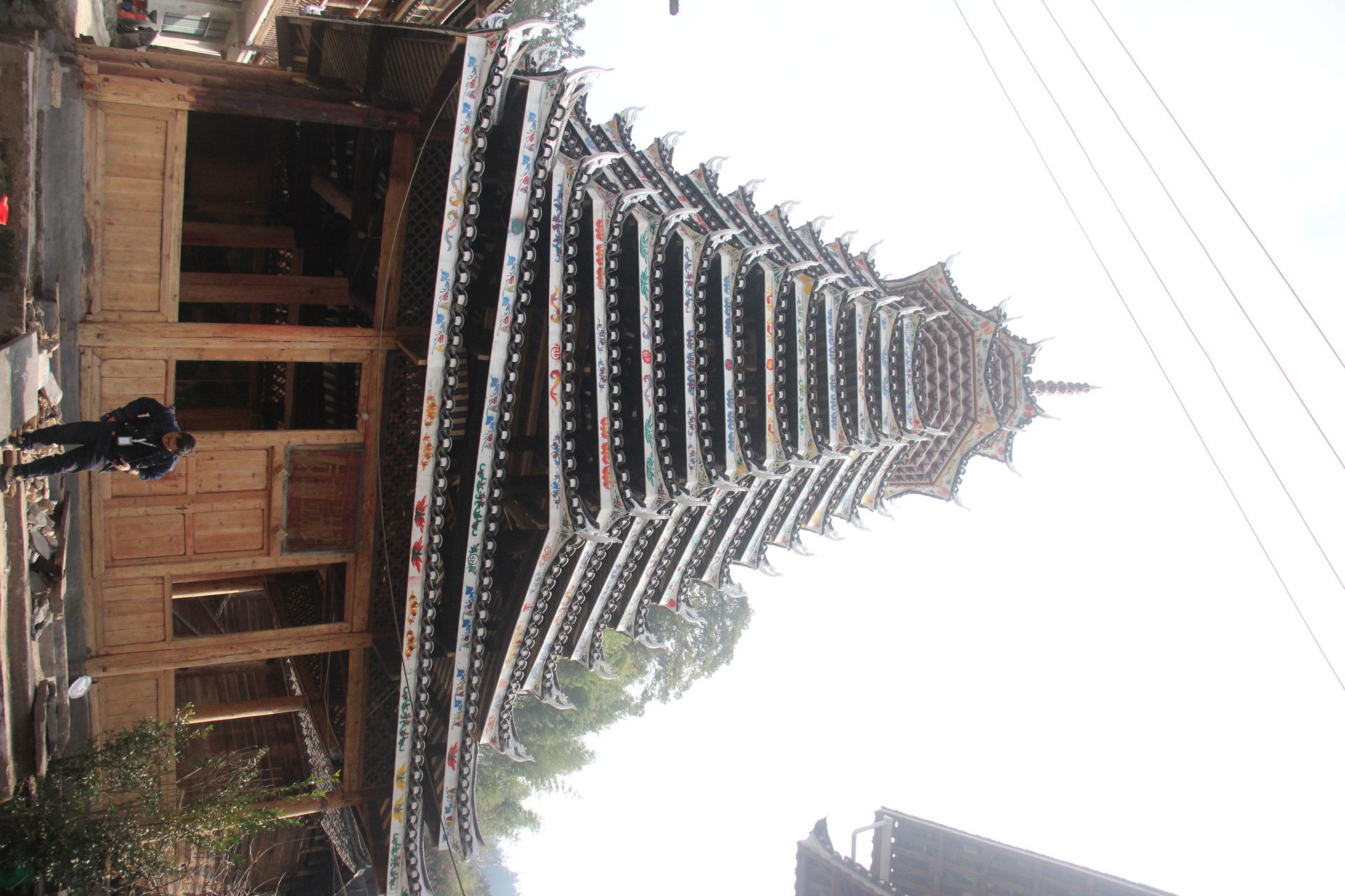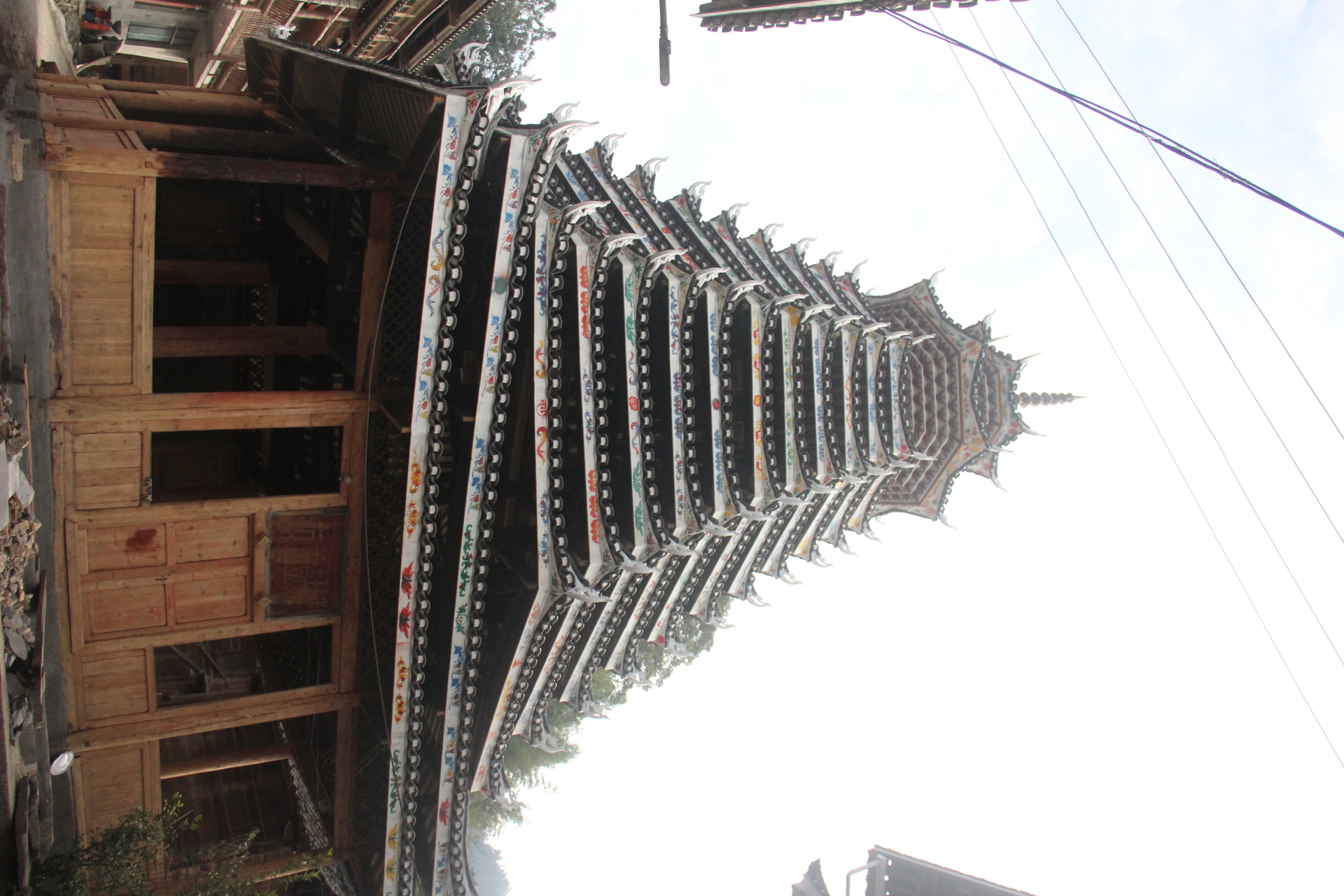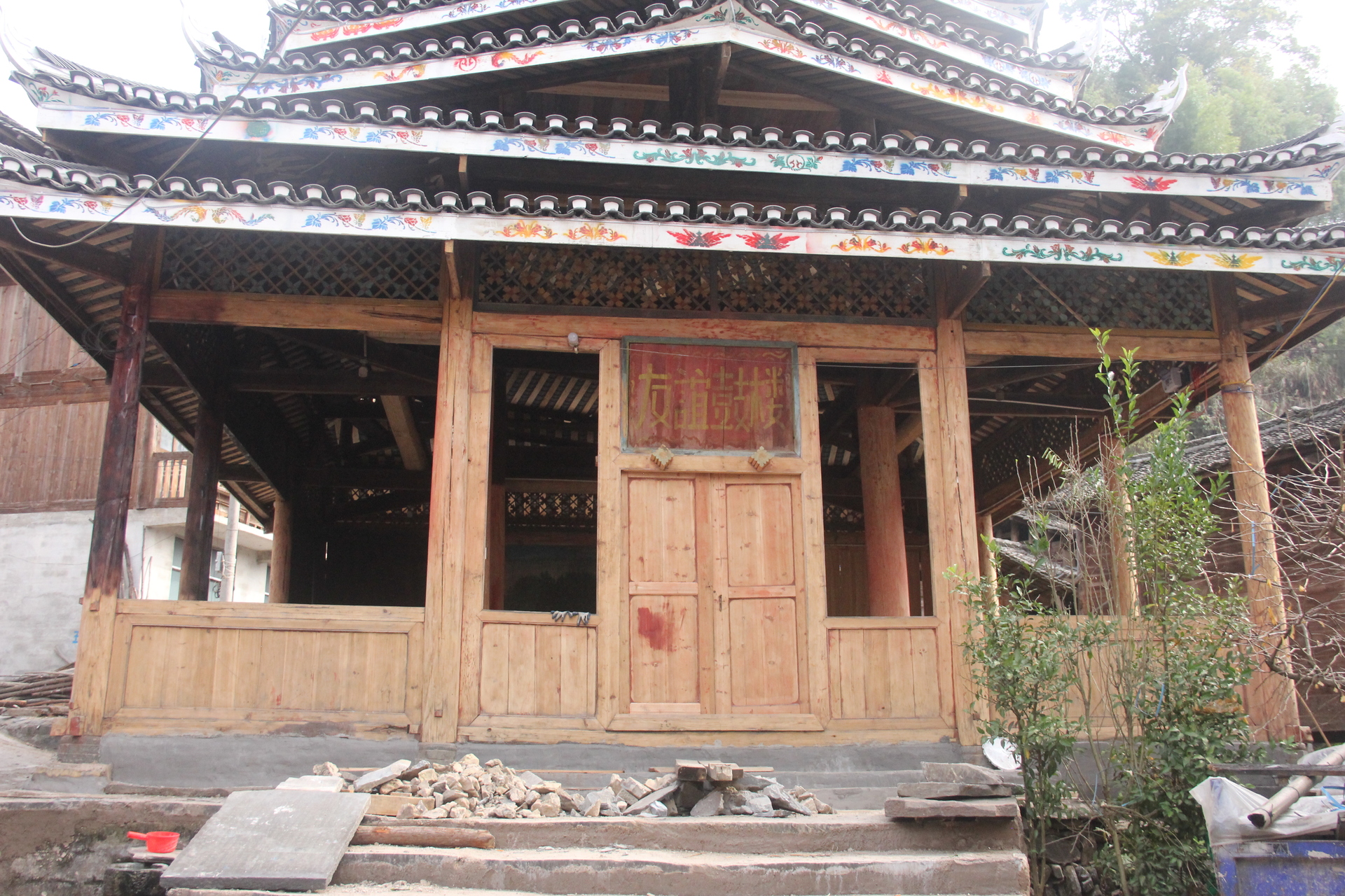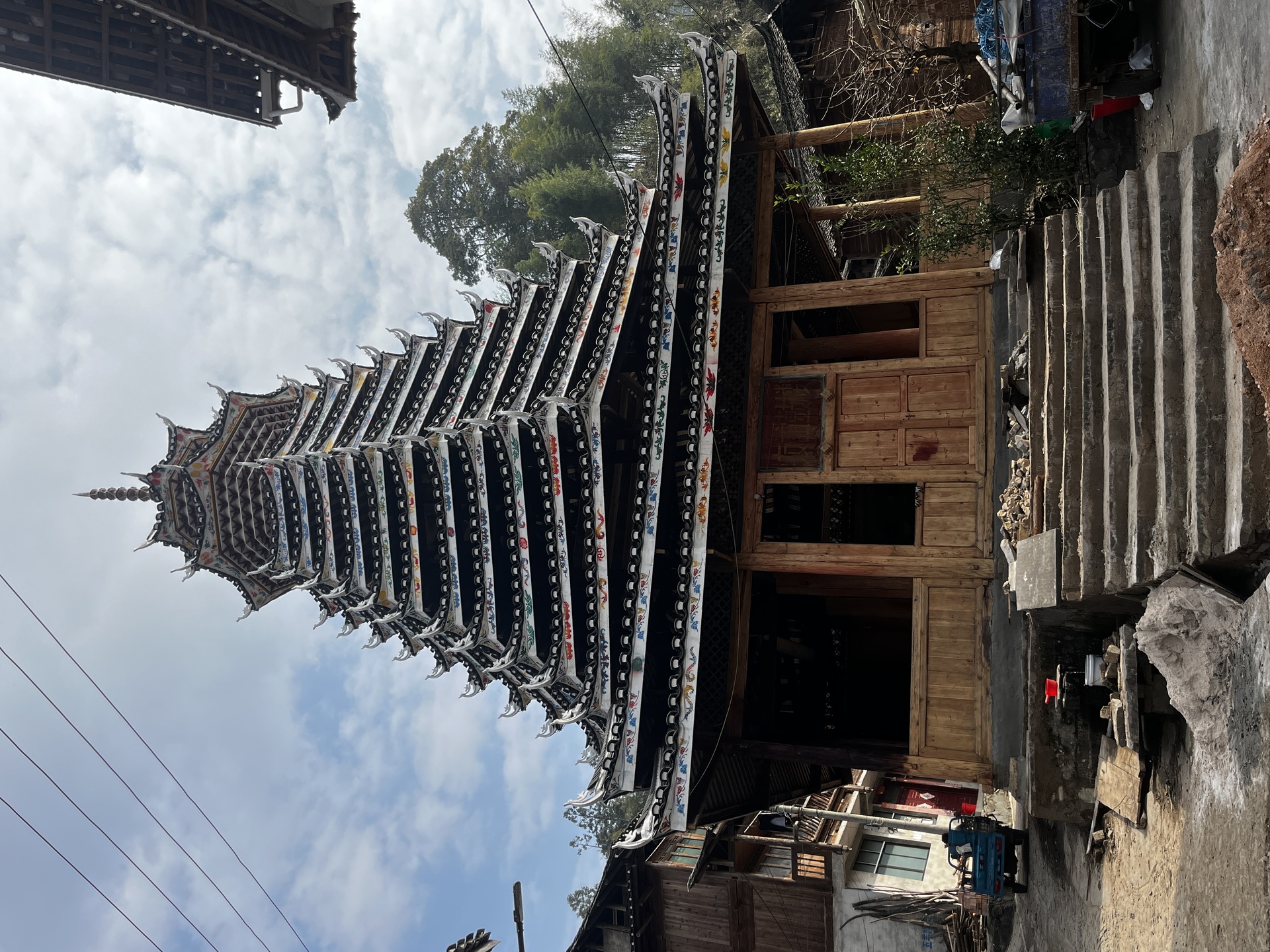 登岑侗寨,友谊鼓楼。1999年 ,2025年修建上漆,(4对12柱)共15层 2层4角 ,11层八角,2层攒尖顶鼓楼