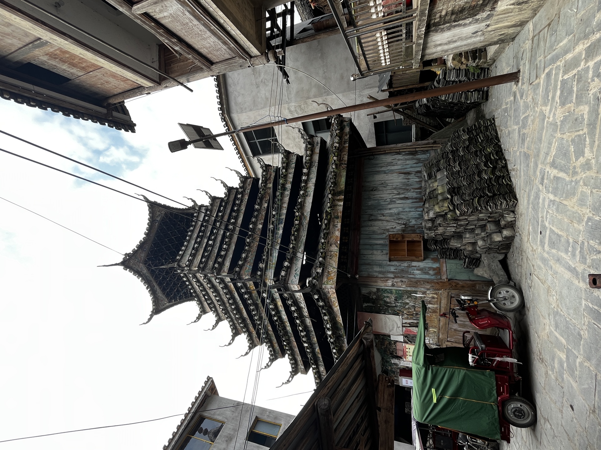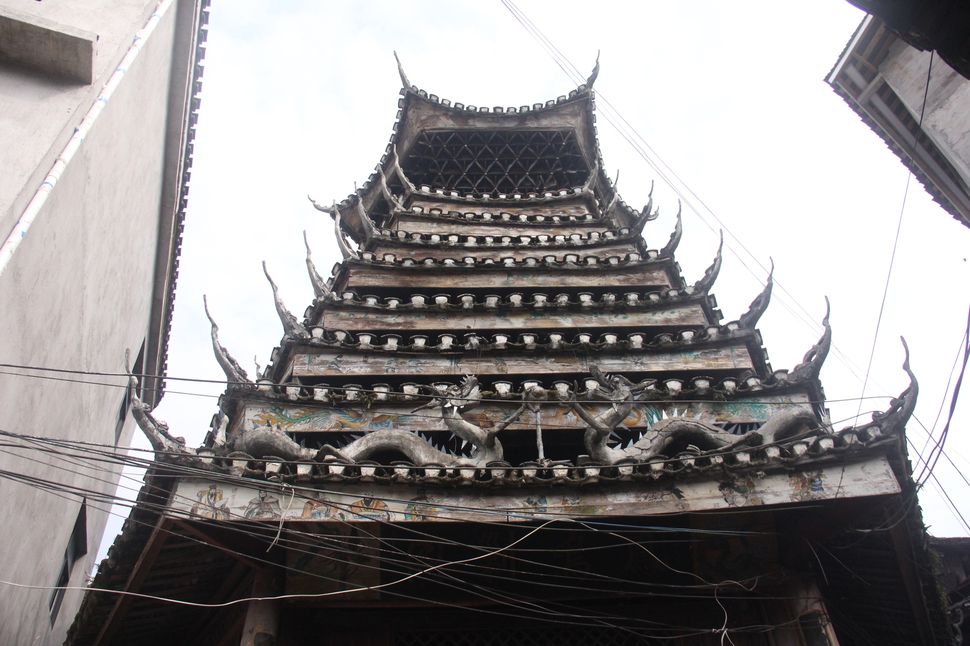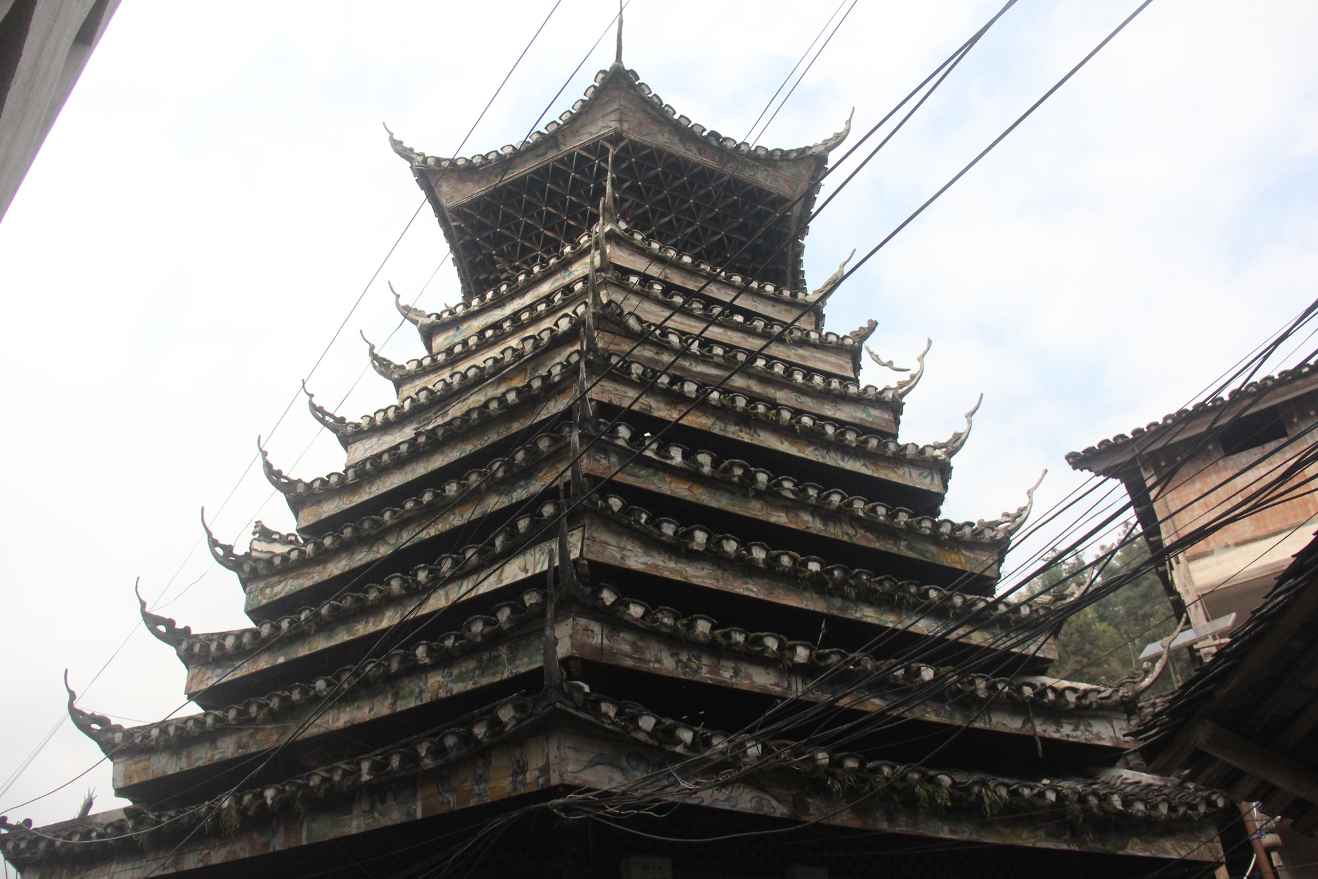 地洞侗寨 母寨鼓楼 ,(6对6柱)共9层 1攒尖顶鼓楼 ,省级文物。始建于清代,高15米,占地/46.08平