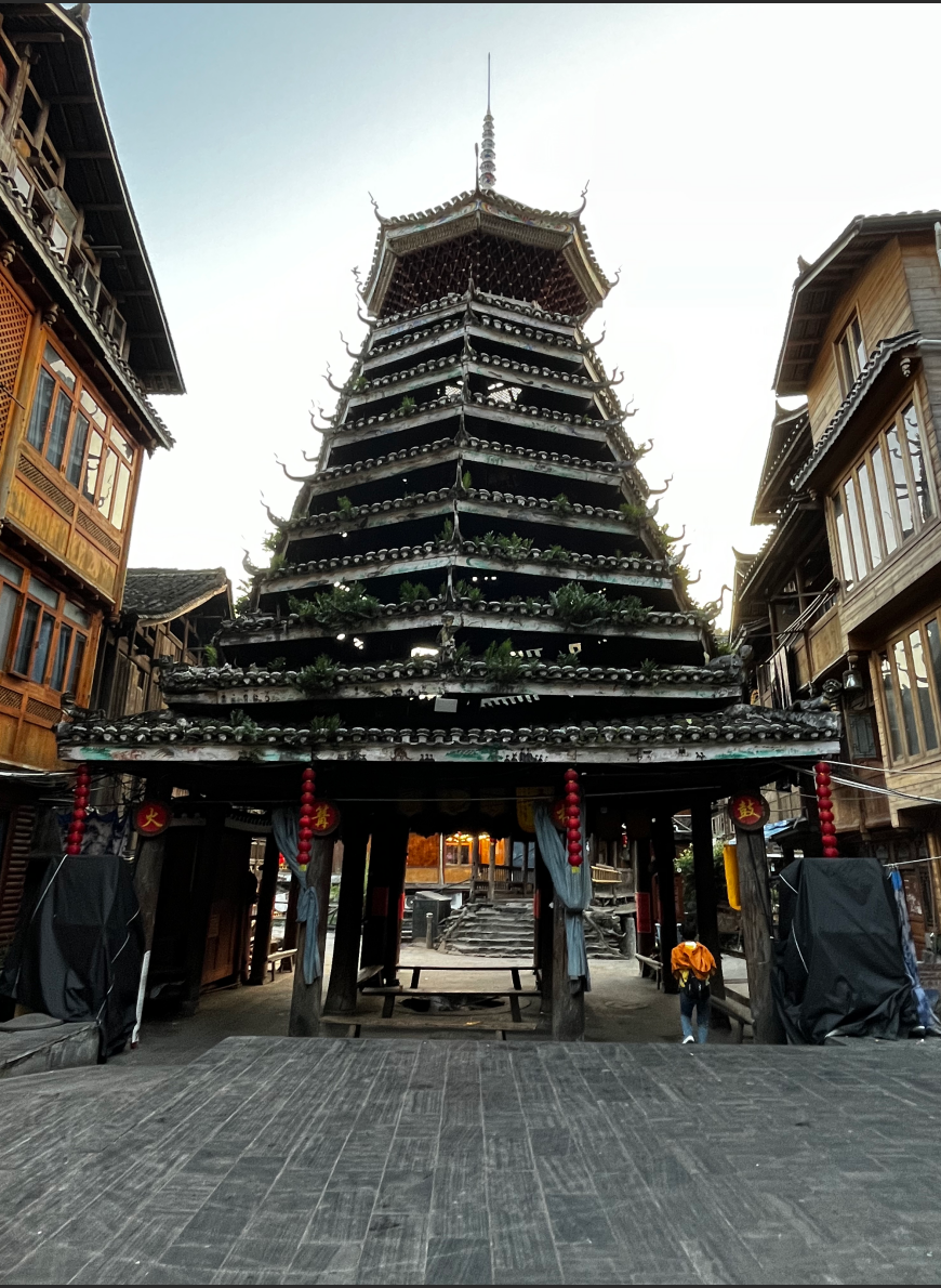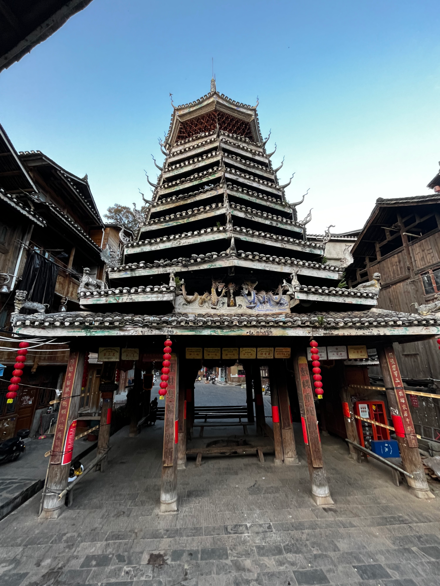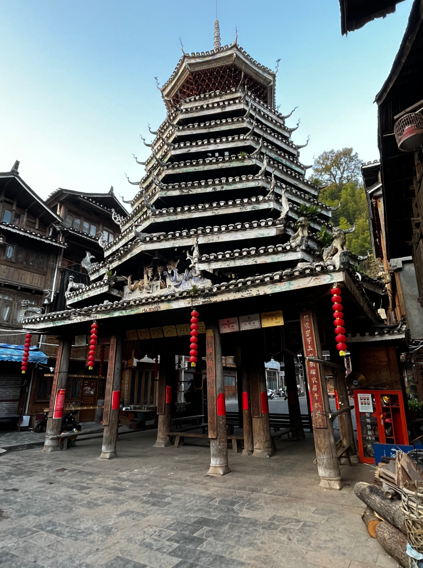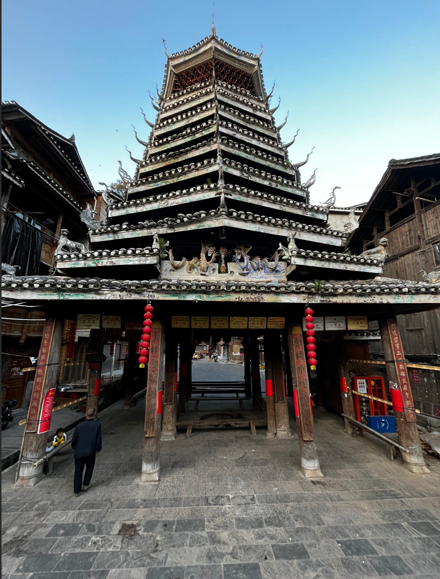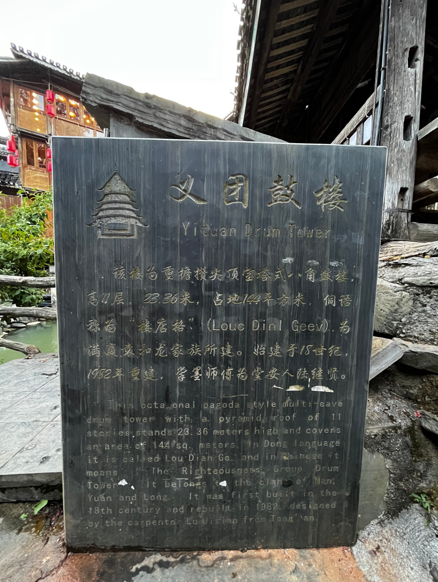 义团鼓楼。该楼为重檐攒头顶宝塔式八角鼓婆,高11层,23.36米,占地144平方米,侗语称为“”楼店格”(Louc Dinl Geev).为满赢袁和龙家族所建。始建予18世纪1982年重建,掌墨师傅为堂安人陆,继贤。