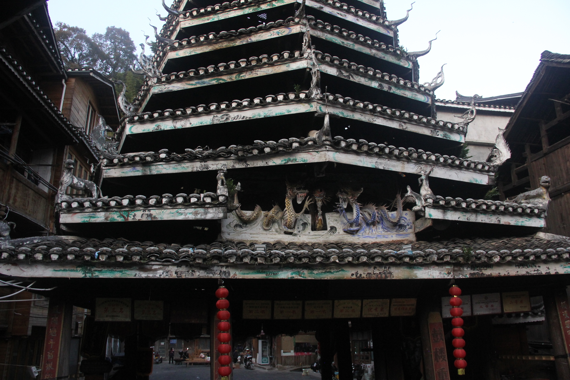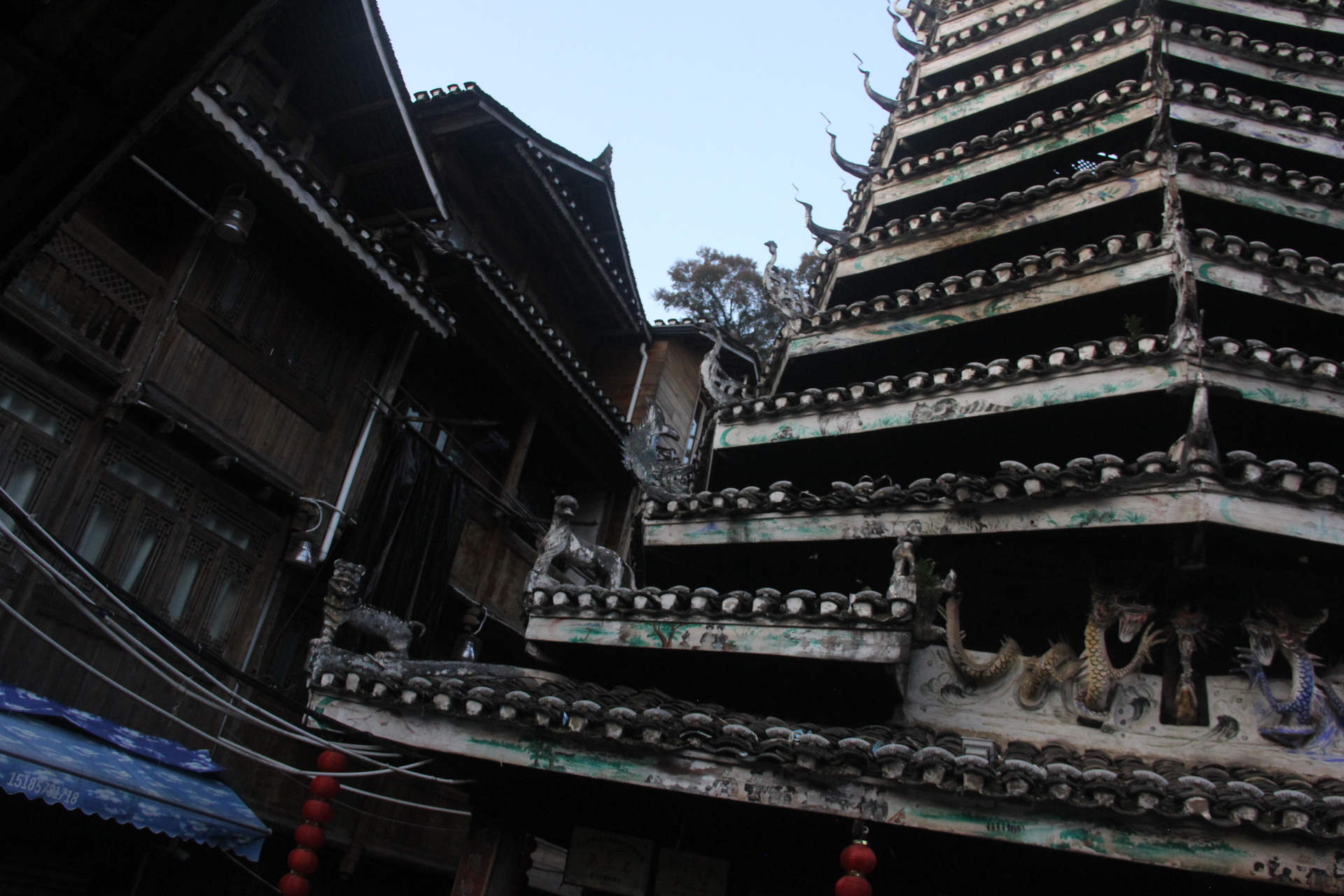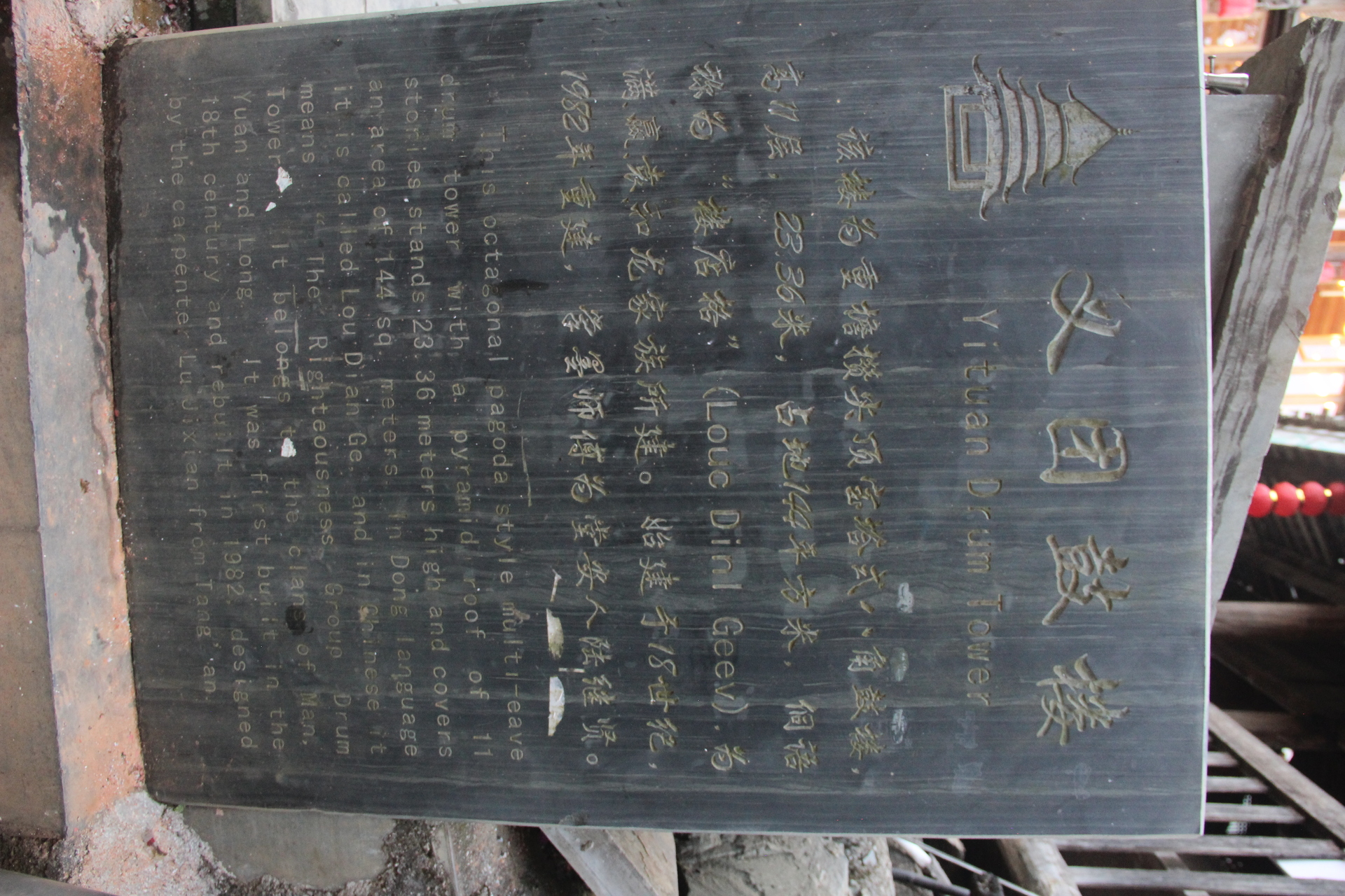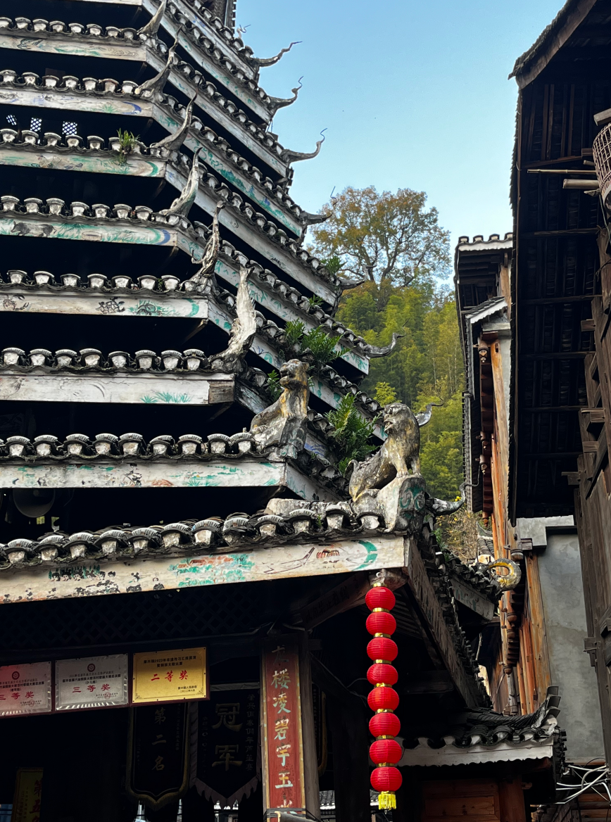 义团鼓楼。该楼为重檐攒头顶宝塔式八角鼓婆,高11层,23.36米,占地144平方米,侗语称为“”楼店格”(Louc Dinl Geev).为满赢袁和龙家族所建。始建予18世纪1982年重建,掌墨师傅为堂安人陆,继贤。