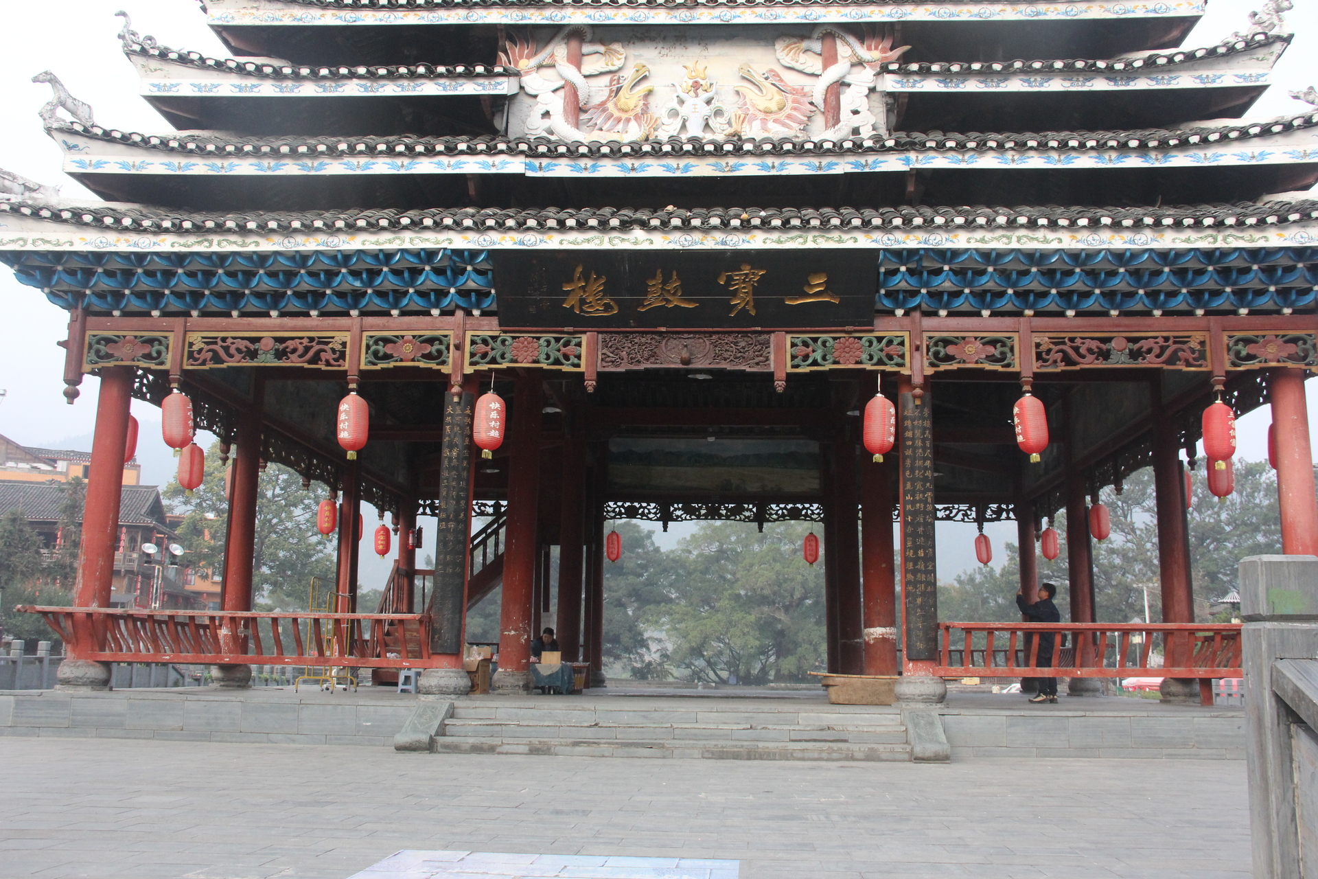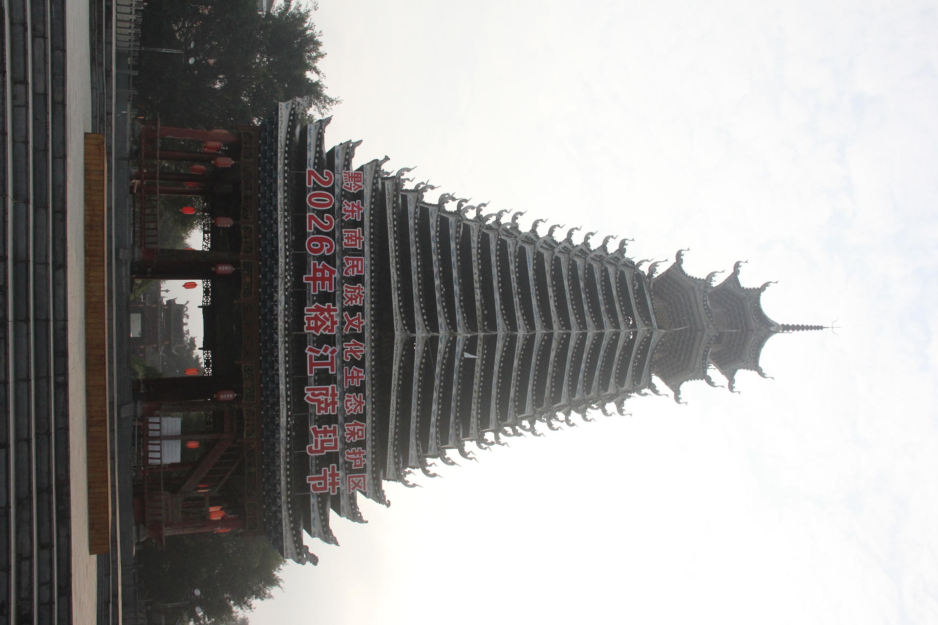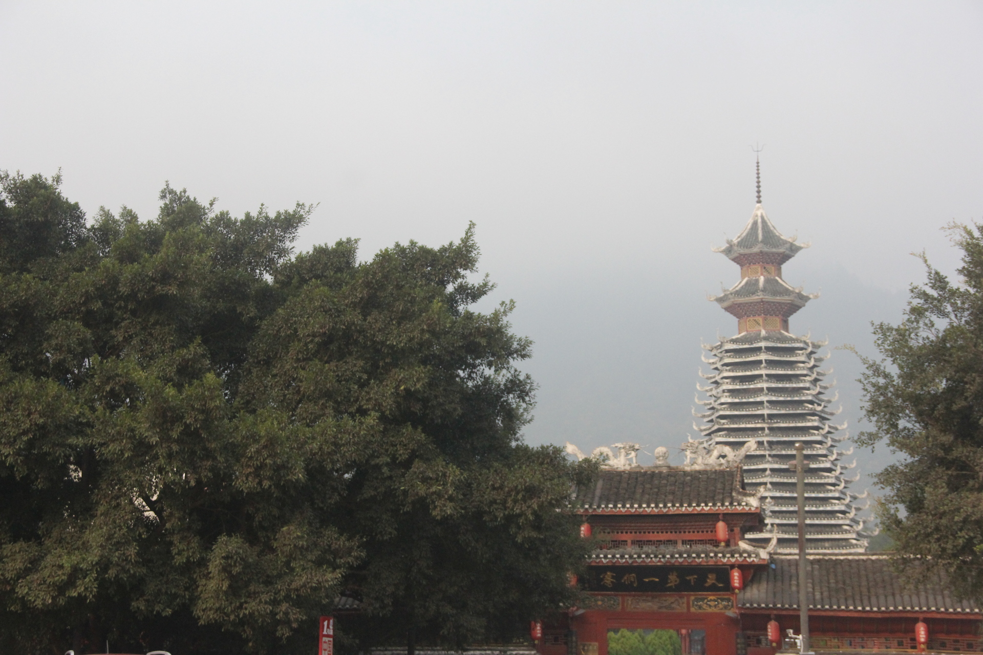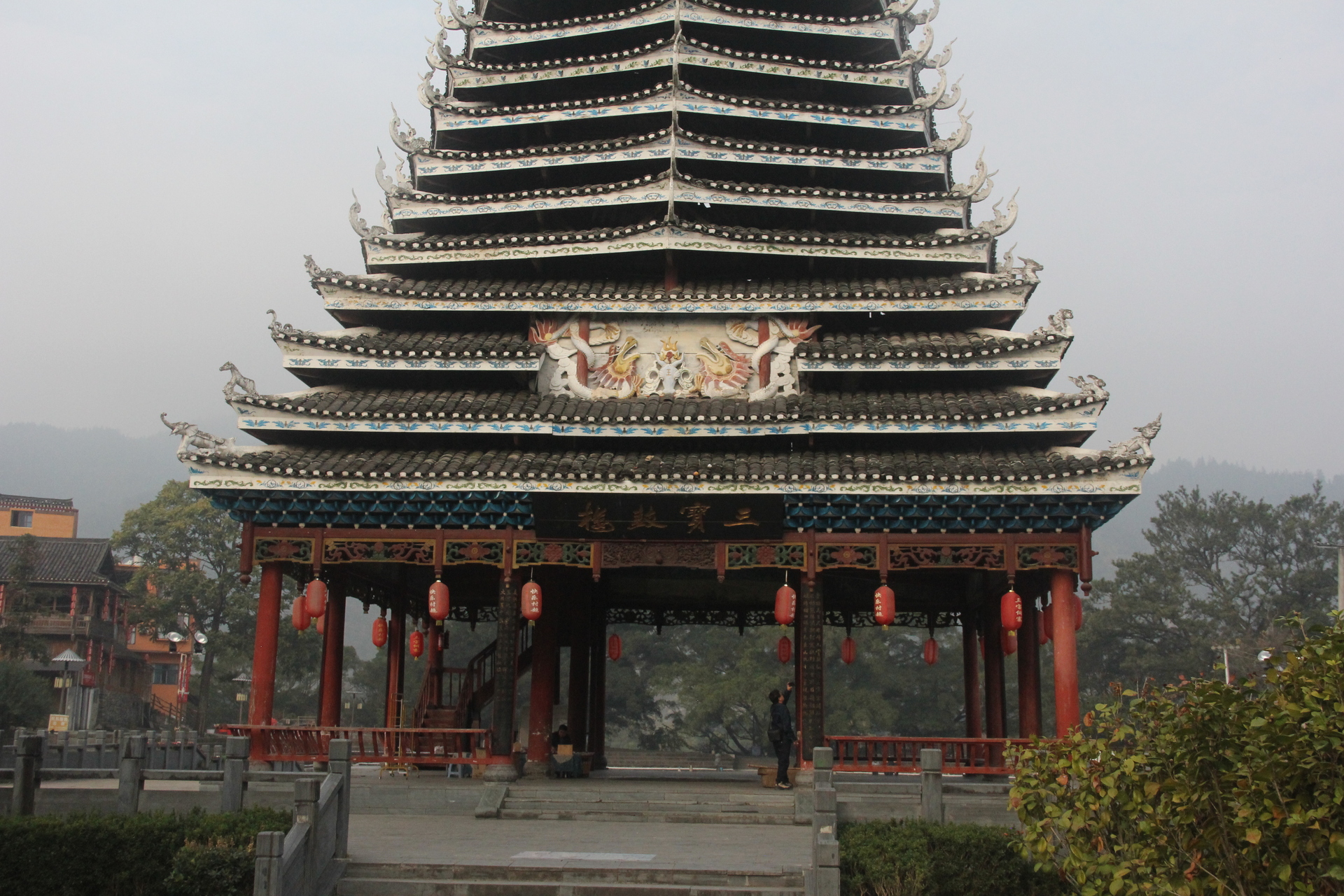 三宝侗寨 三宝鼓楼(4对8柱)共21层 (4角4层 2层攒尖顶鼓楼,2001年 建设单位:榕江人民政府,林业局,施工单位 黎平县民族古建筑公司、城市综合总开发公司,经理:杨应琪,总经理:周长波)