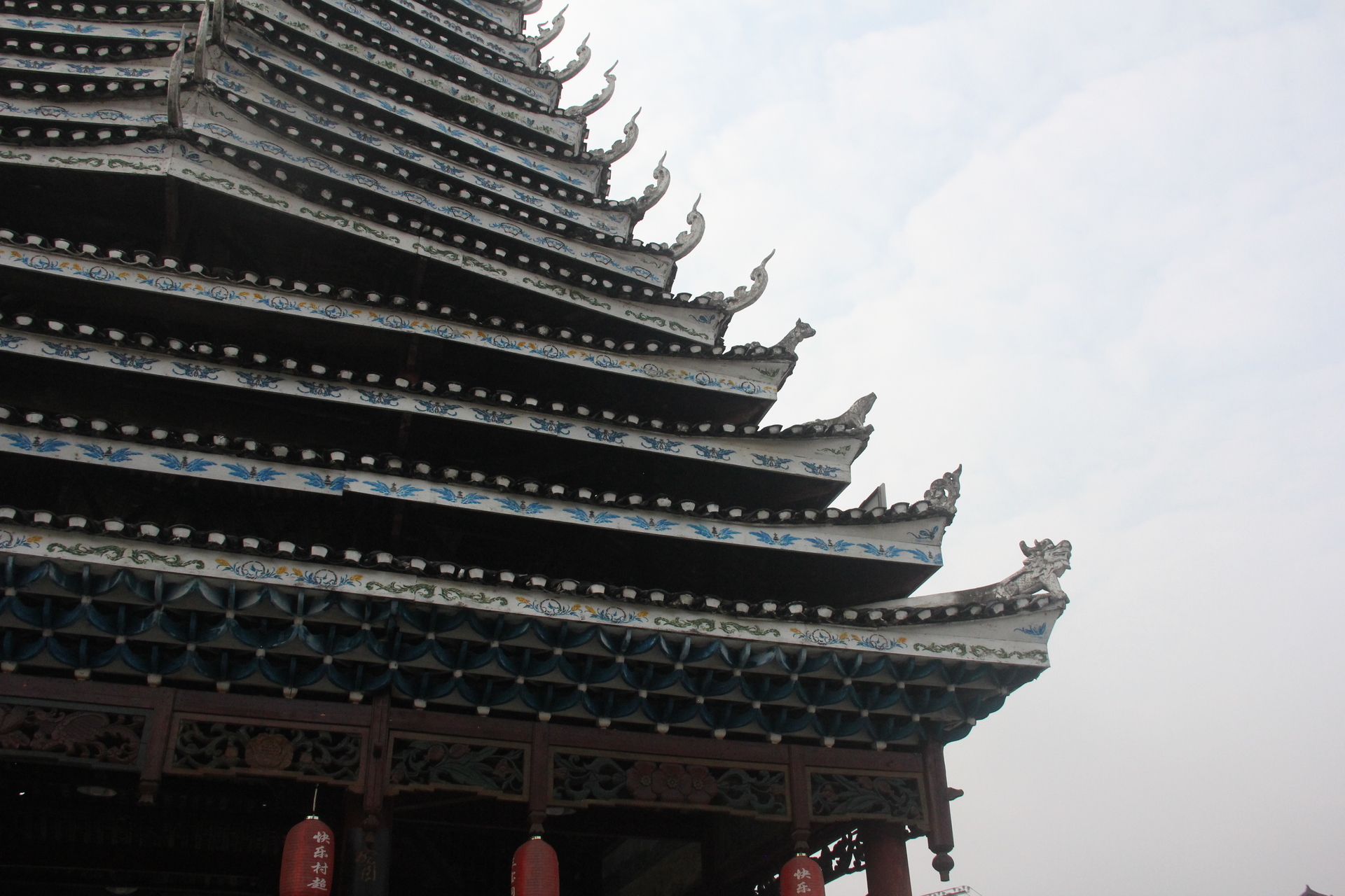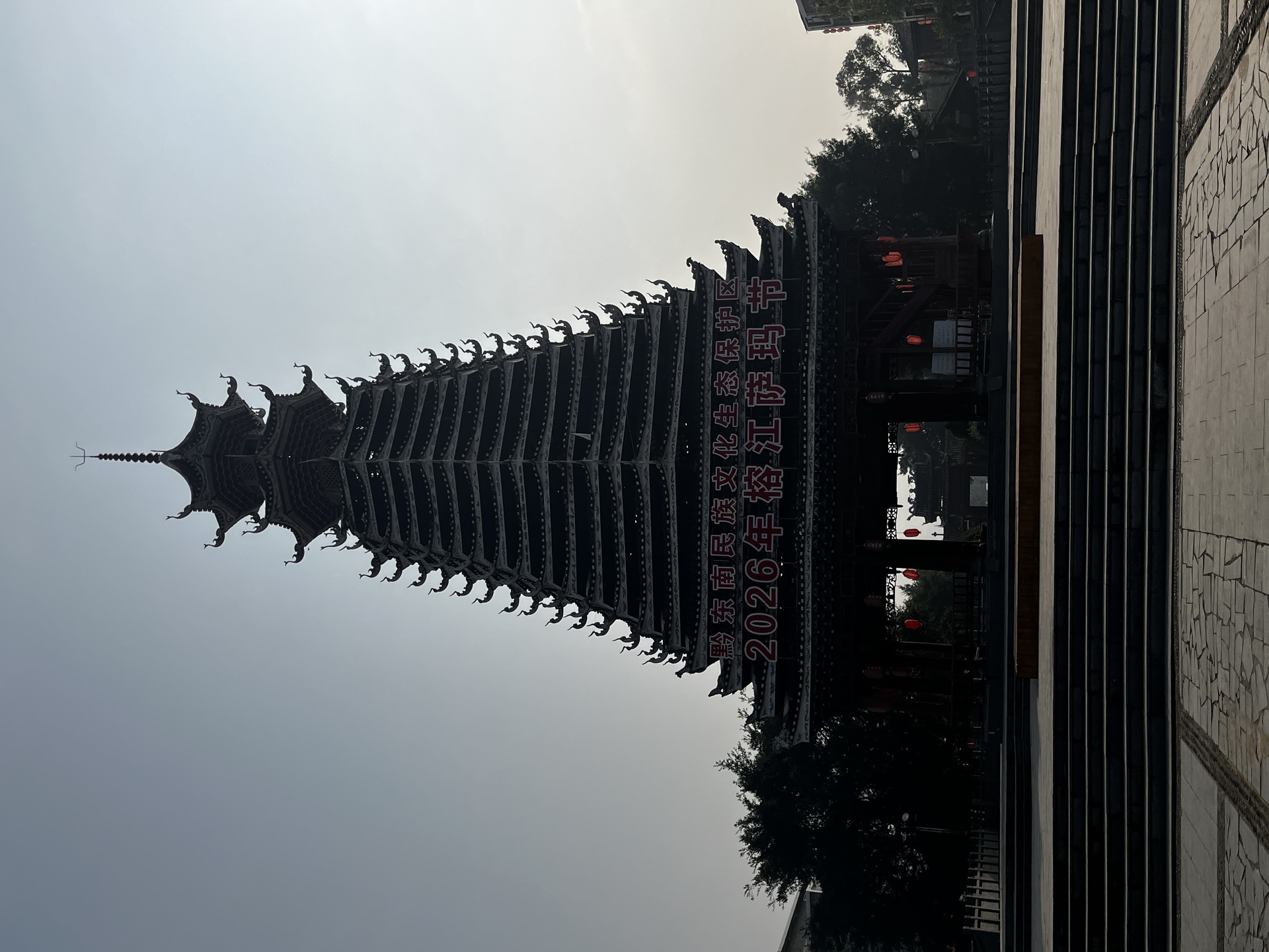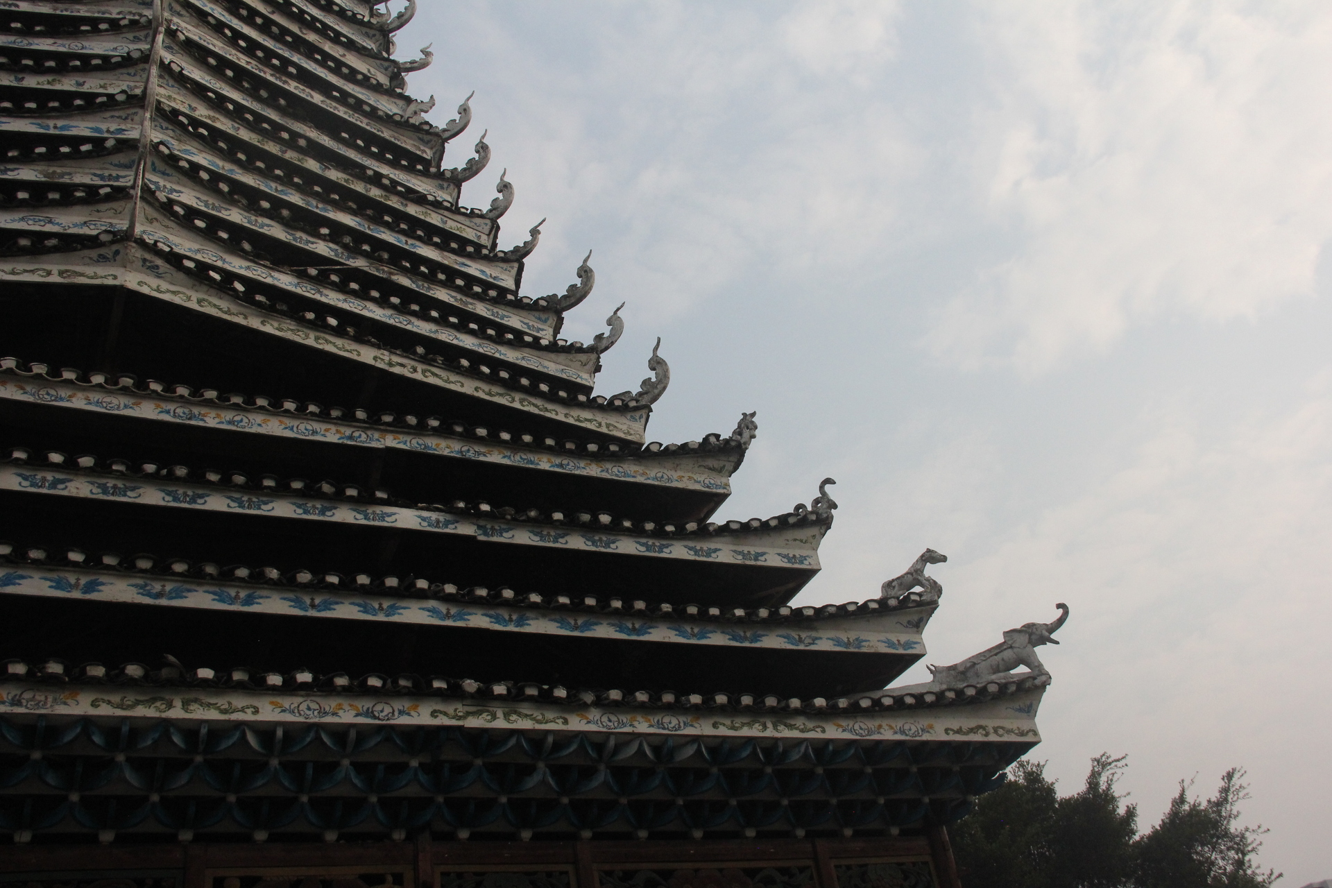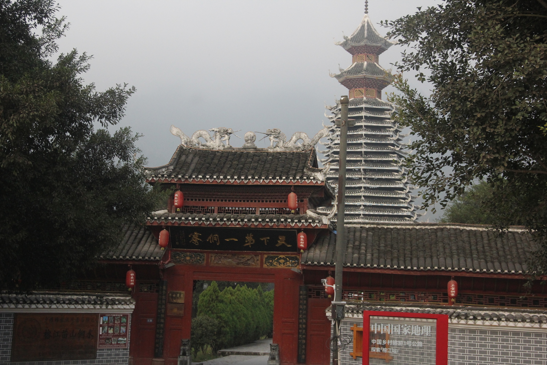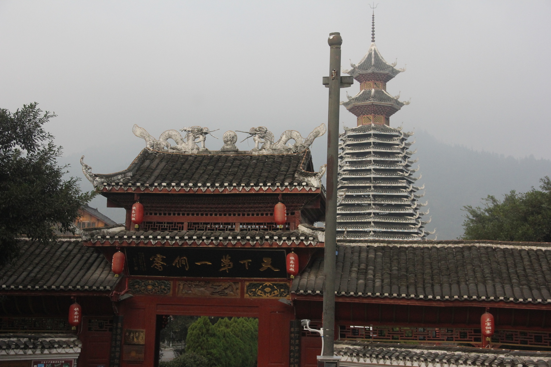 三宝侗寨 三宝鼓楼(4对8柱)共21层 (4角4层 2层攒尖顶鼓楼,2001年 建设单位:榕江人民政府,林业局,施工单位 黎平县民族古建筑公司、城市综合总开发公司,经理:杨应琪,总经理:周长波)