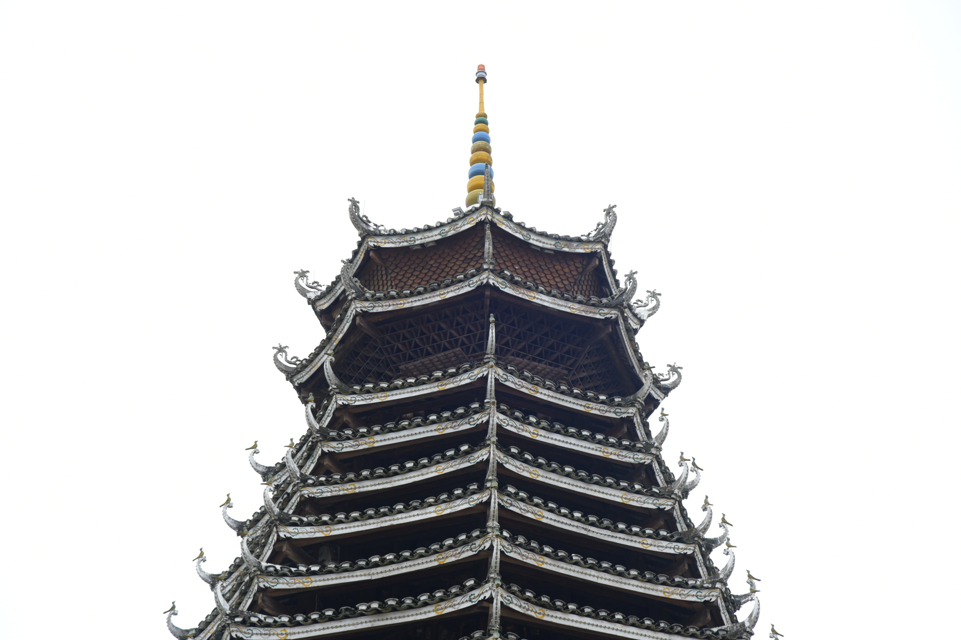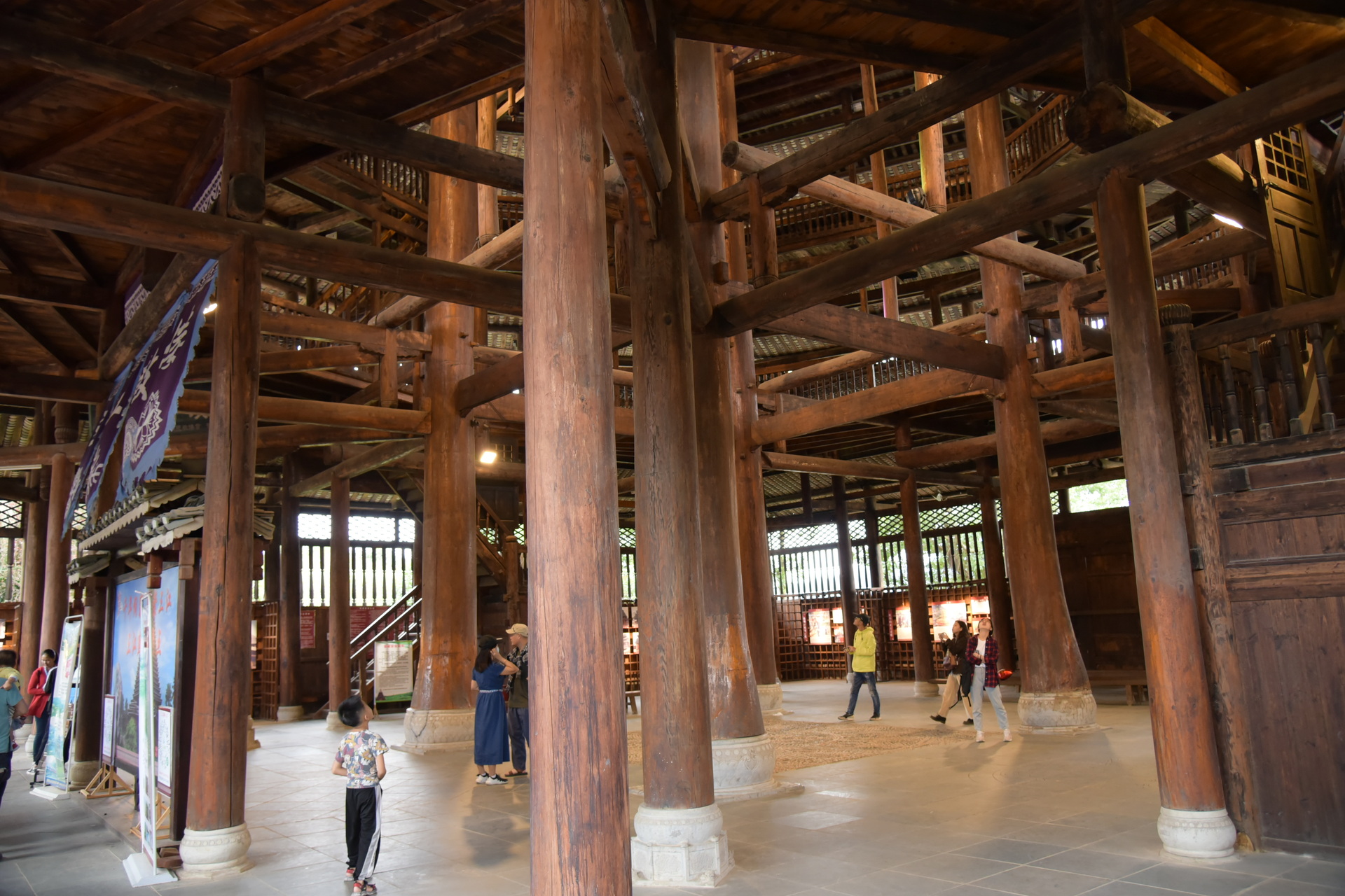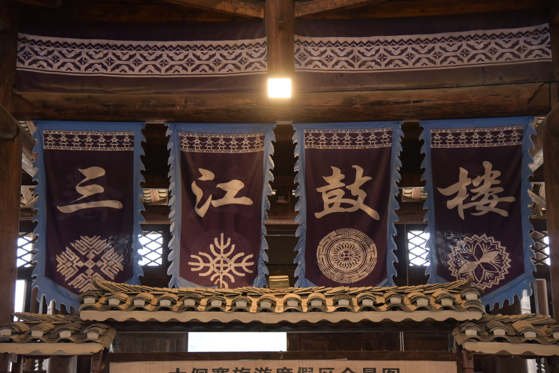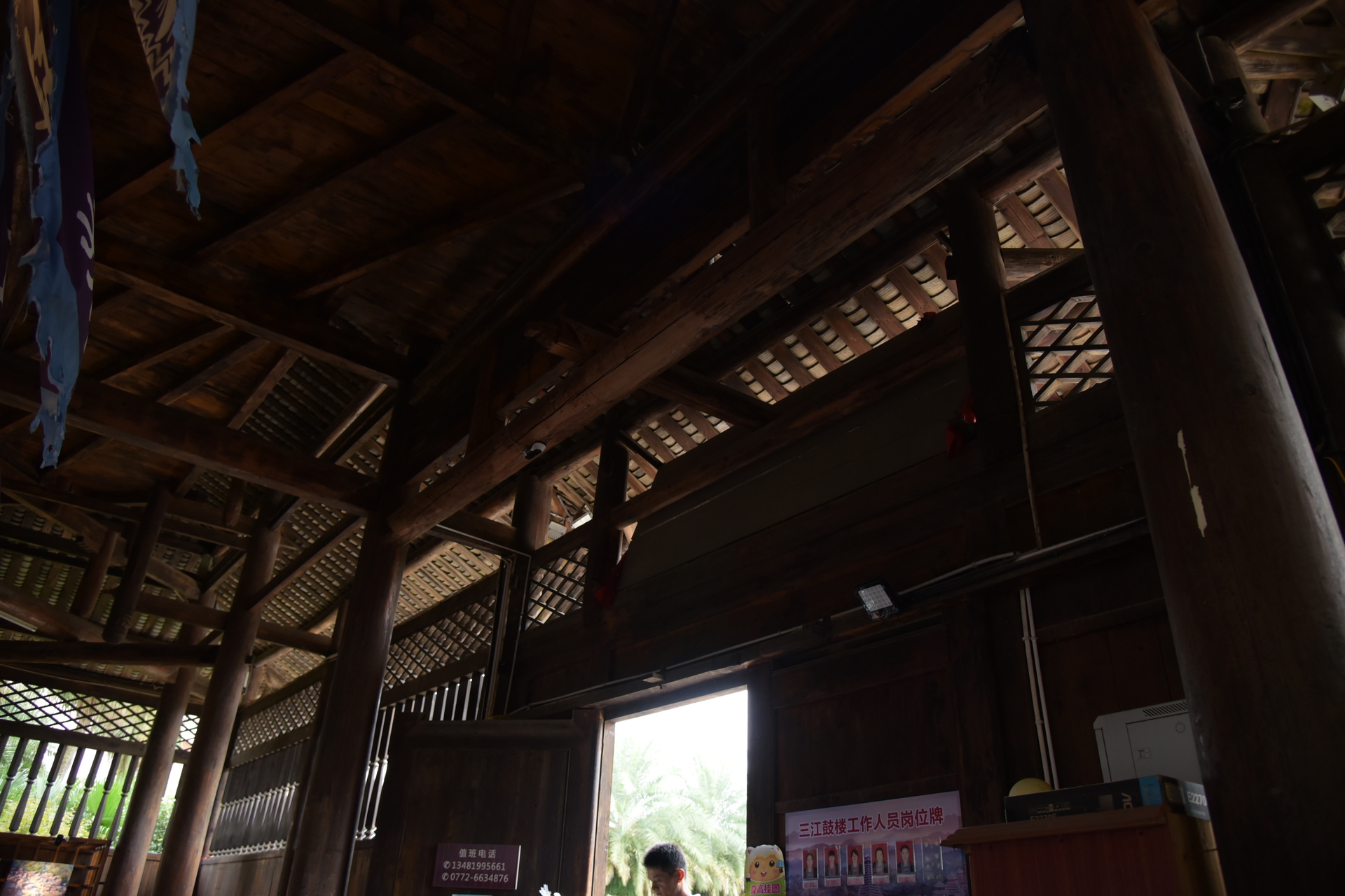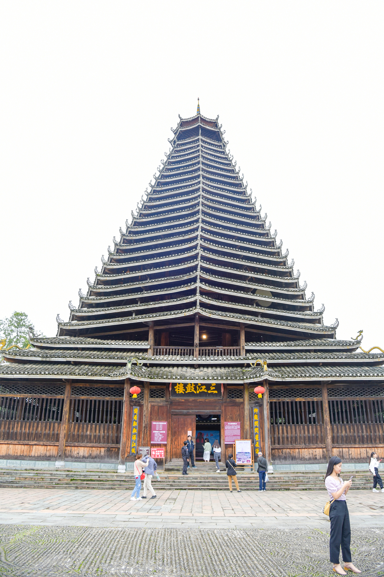 三江鼓楼高42.6米,共有60根柱头着地,占地面积600平方米。鼓楼共有27层瓦檐,除楼顶两层外,其余25层瓦面等距收分,层层紧缩,使楼面呈金字塔形,显得端庄平稳。每层檐角轻盈起翘,精巧的雕饰以及鲜艳的檐板彩绘,与庞大、粗犷的楼身形成鲜明对比。楼内四根杉木大柱直径都超过70厘米,树龄均在百年以上,这在鼓楼建筑史上是唯一的。登上鼓楼的观礼台,三江全景尽收眼底。