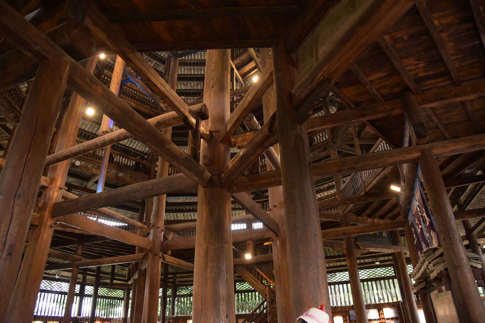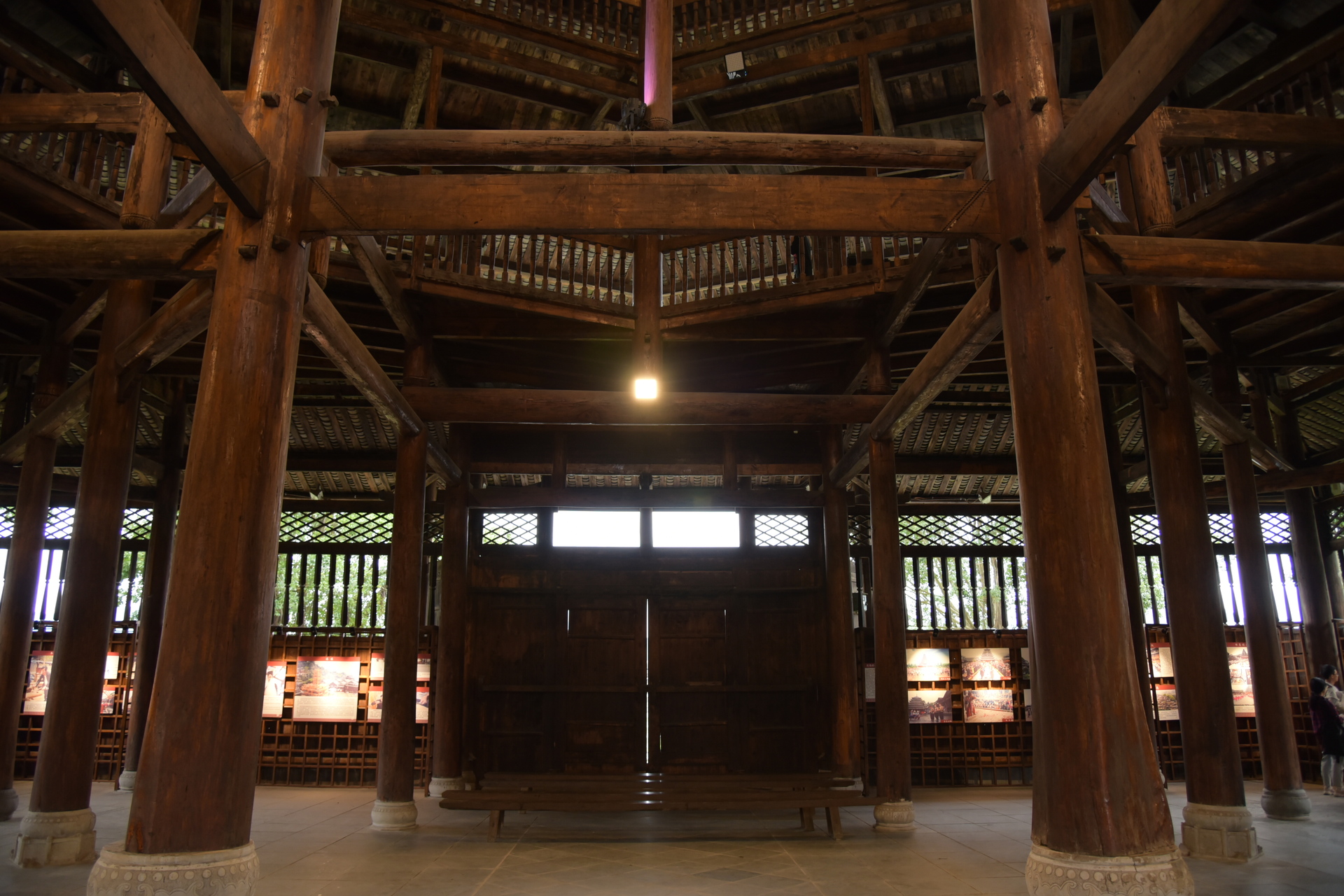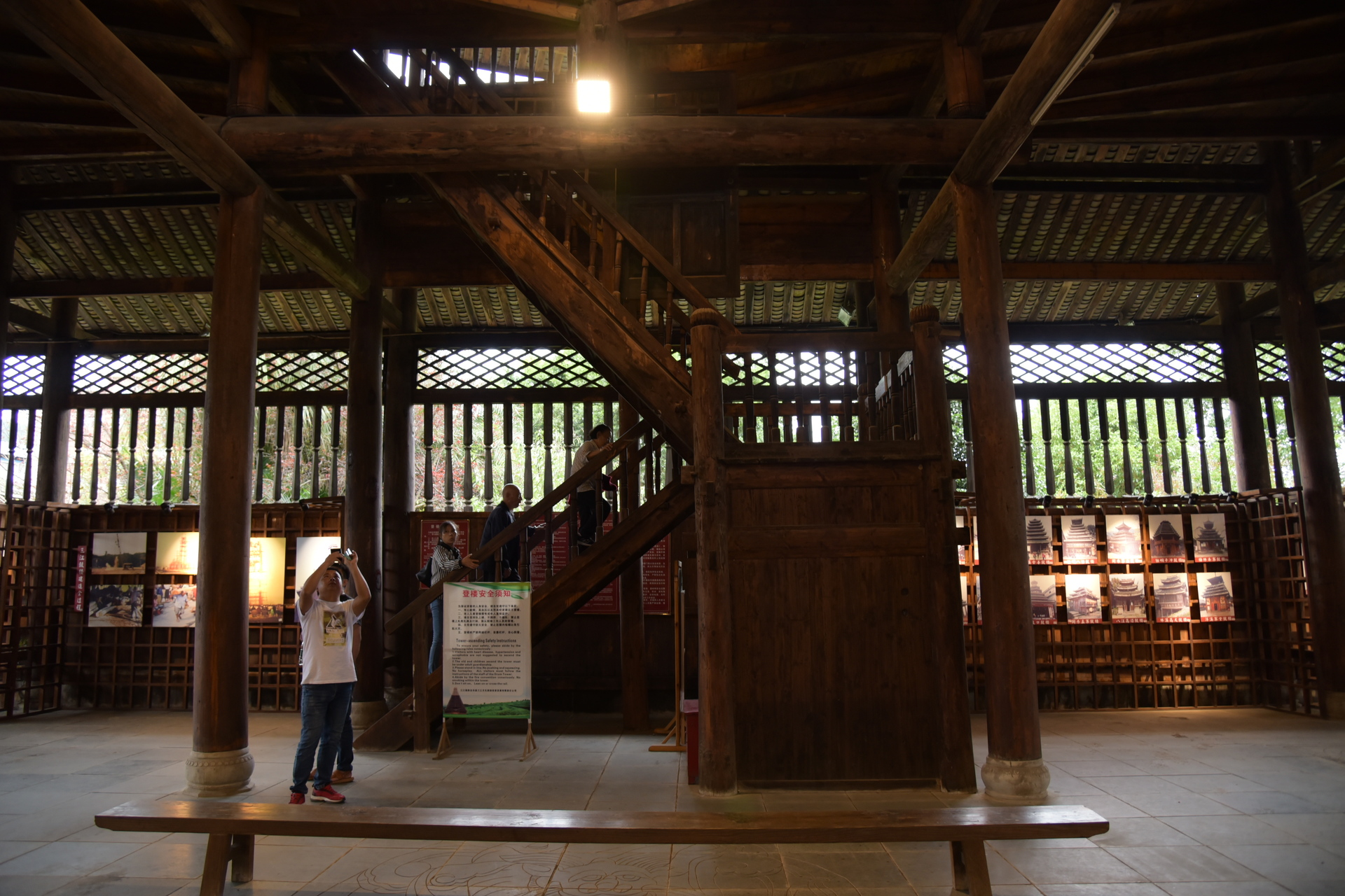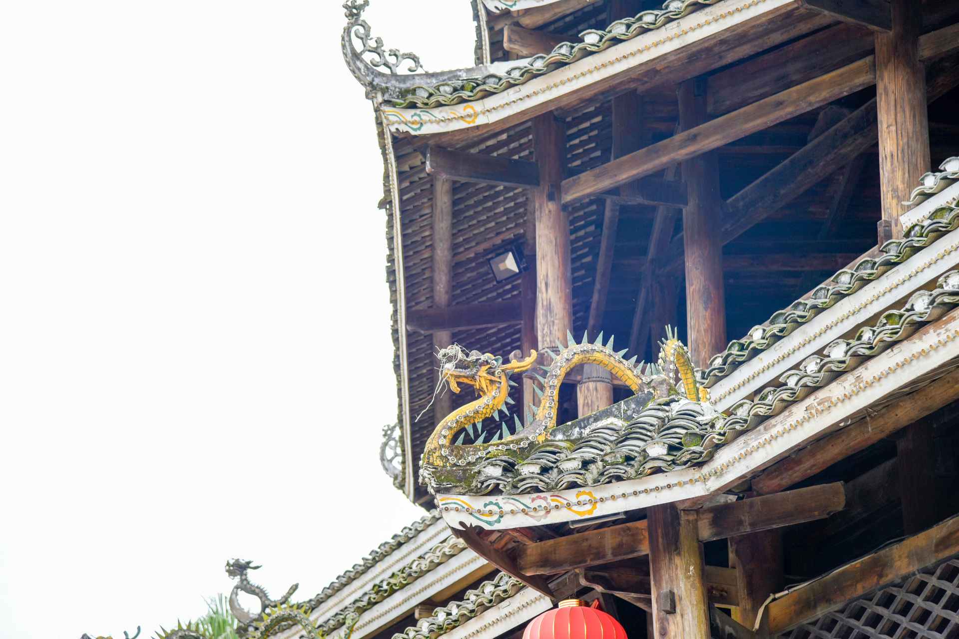 三江鼓楼高42.6米,共有60根柱头着地,占地面积600平方米。鼓楼共有27层瓦檐,除楼顶两层外,其余25层瓦面等距收分,层层紧缩,使楼面呈金字塔形,显得端庄平稳。每层檐角轻盈起翘,精巧的雕饰以及鲜艳的檐板彩绘,与庞大、粗犷的楼身形成鲜明对比。楼内四根杉木大柱直径都超过70厘米,树龄均在百年以上,这在鼓楼建筑史上是唯一的。登上鼓楼的观礼台,三江全景尽收眼底。
