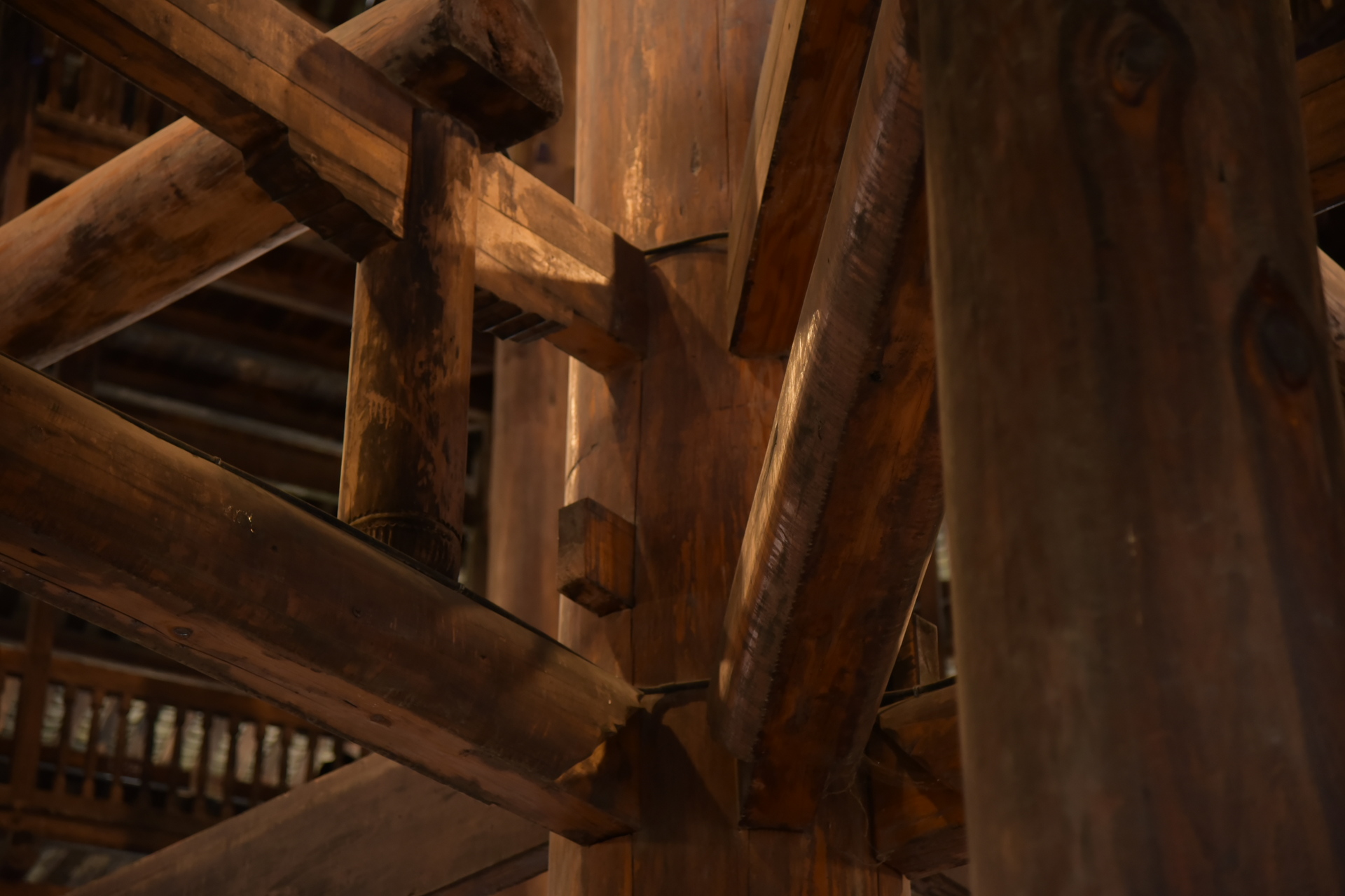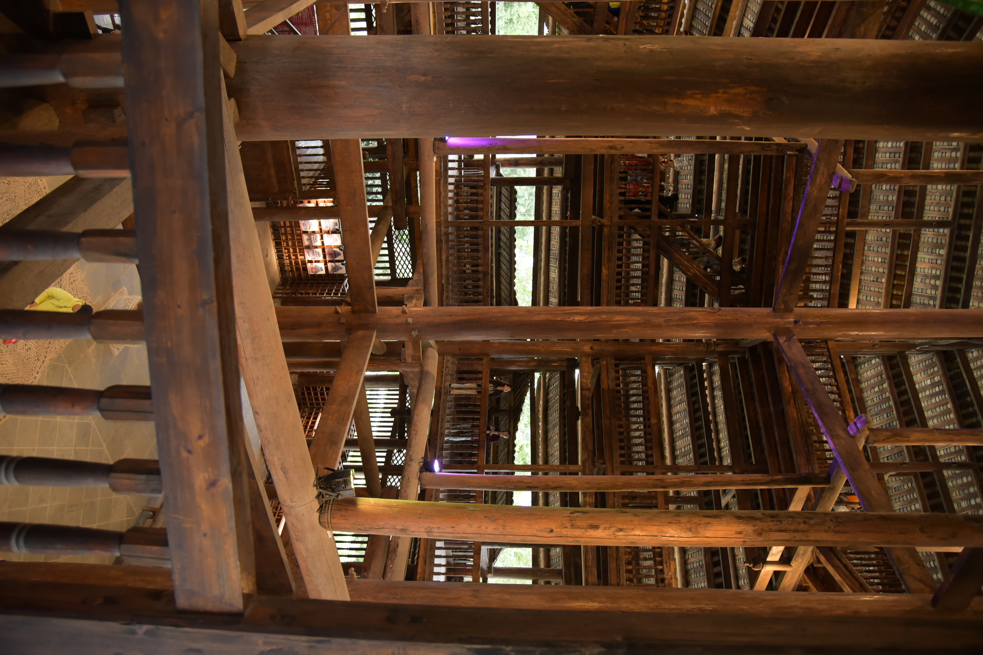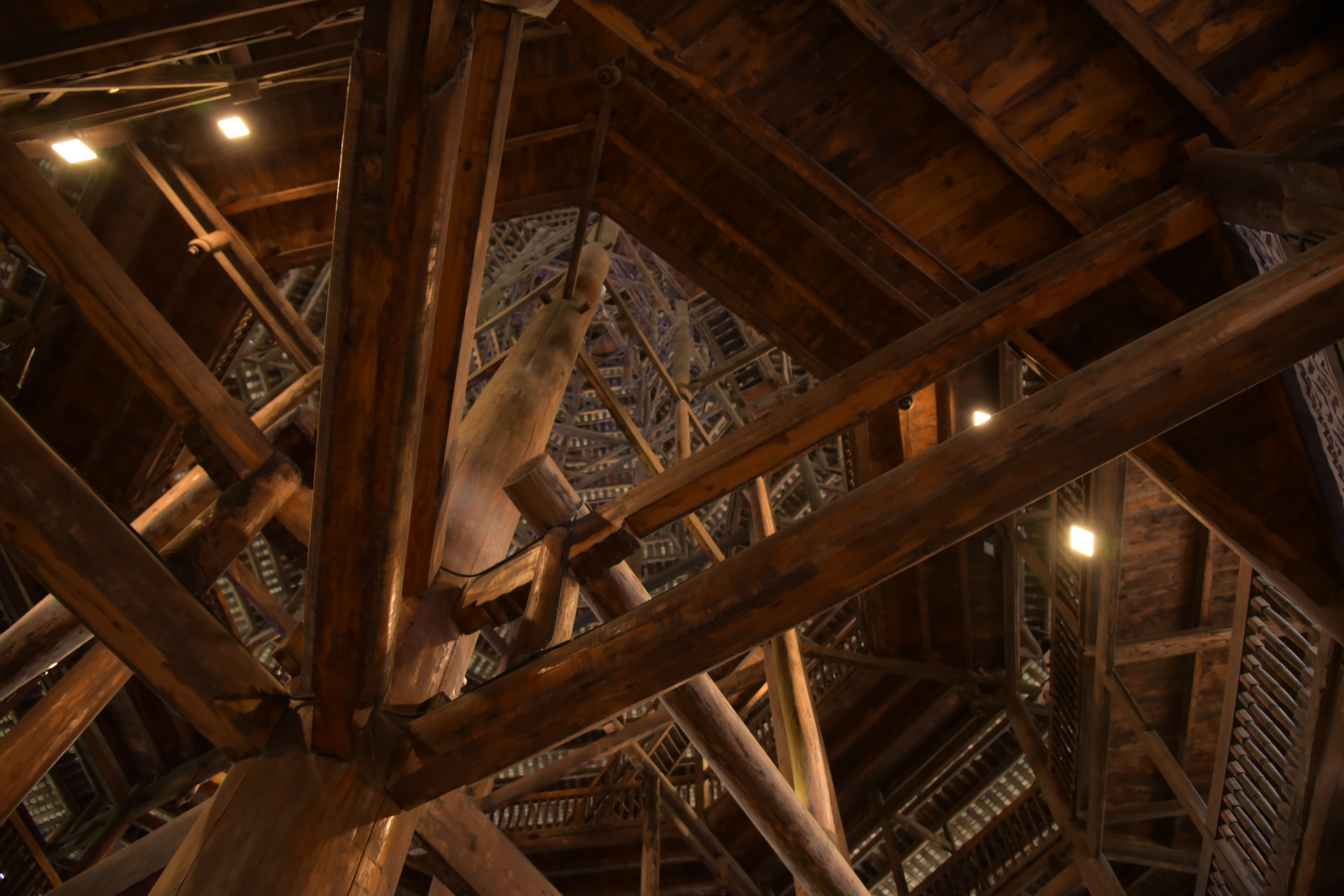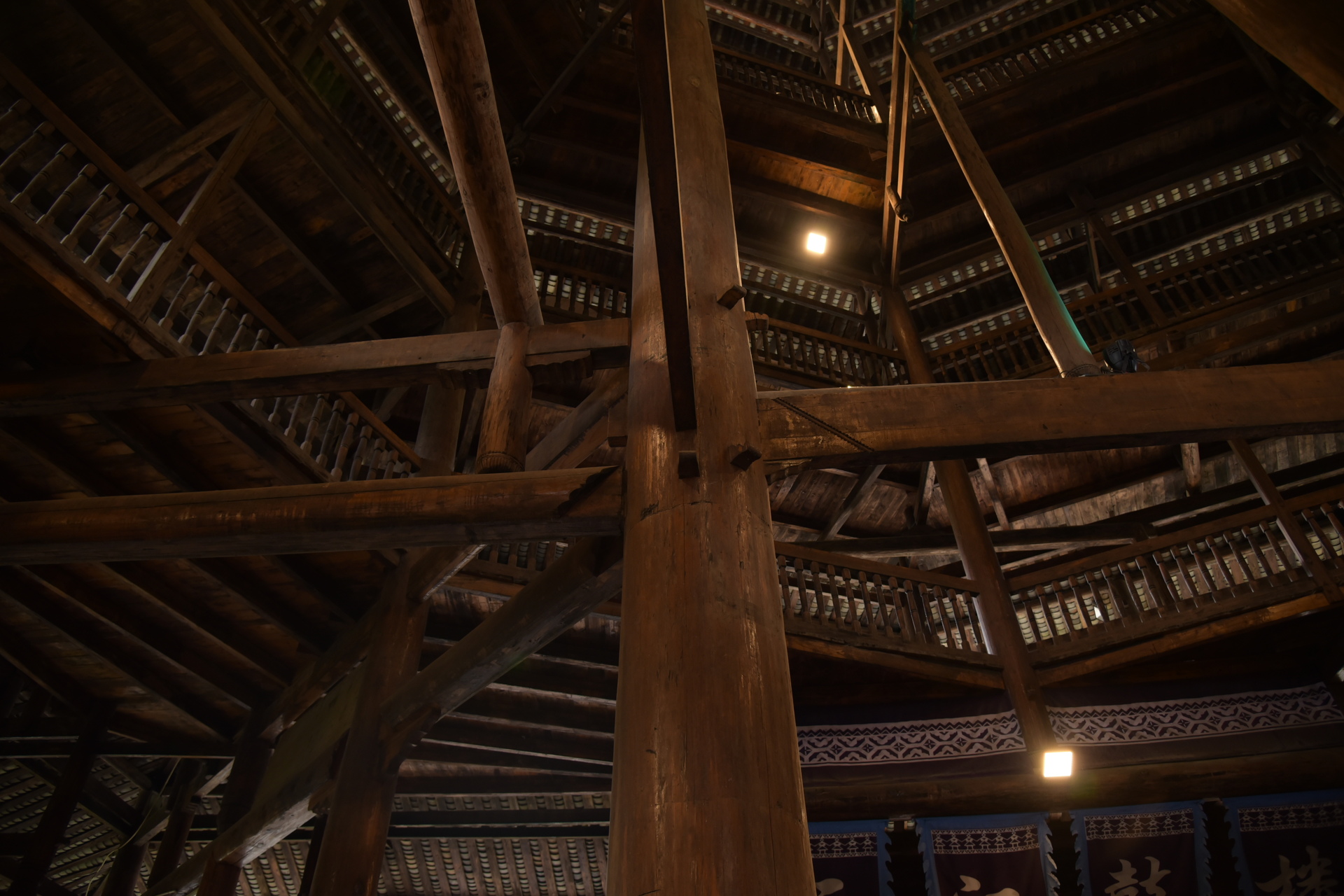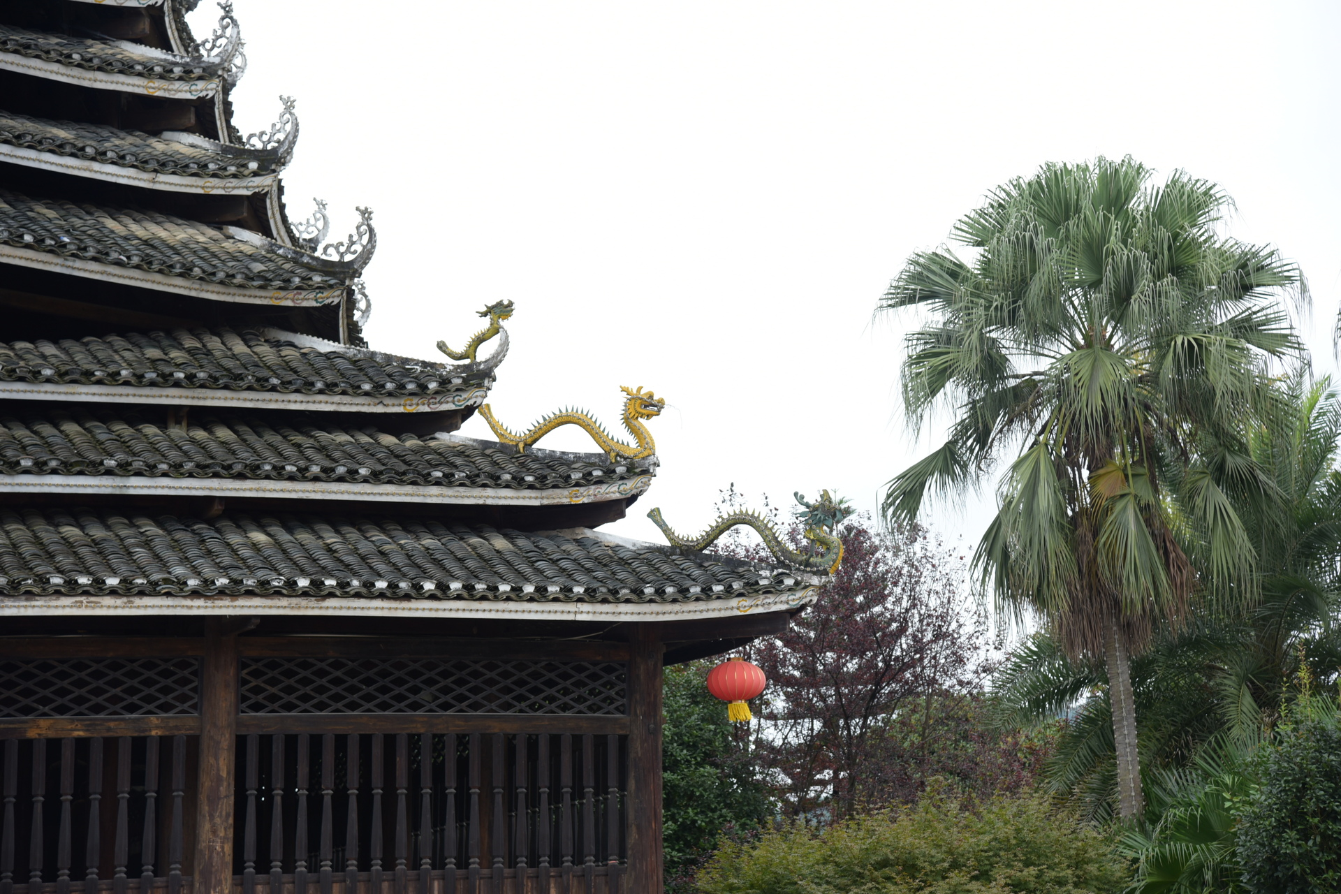 三江鼓楼高42.6米,共有60根柱头着地,占地面积600平方米。鼓楼共有27层瓦檐,除楼顶两层外,其余25层瓦面等距收分,层层紧缩,使楼面呈金字塔形,显得端庄平稳。每层檐角轻盈起翘,精巧的雕饰以及鲜艳的檐板彩绘,与庞大、粗犷的楼身形成鲜明对比。楼内四根杉木大柱直径都超过70厘米,树龄均在百年以上,这在鼓楼建筑史上是唯一的。登上鼓楼的观礼台,三江全景尽收眼底。