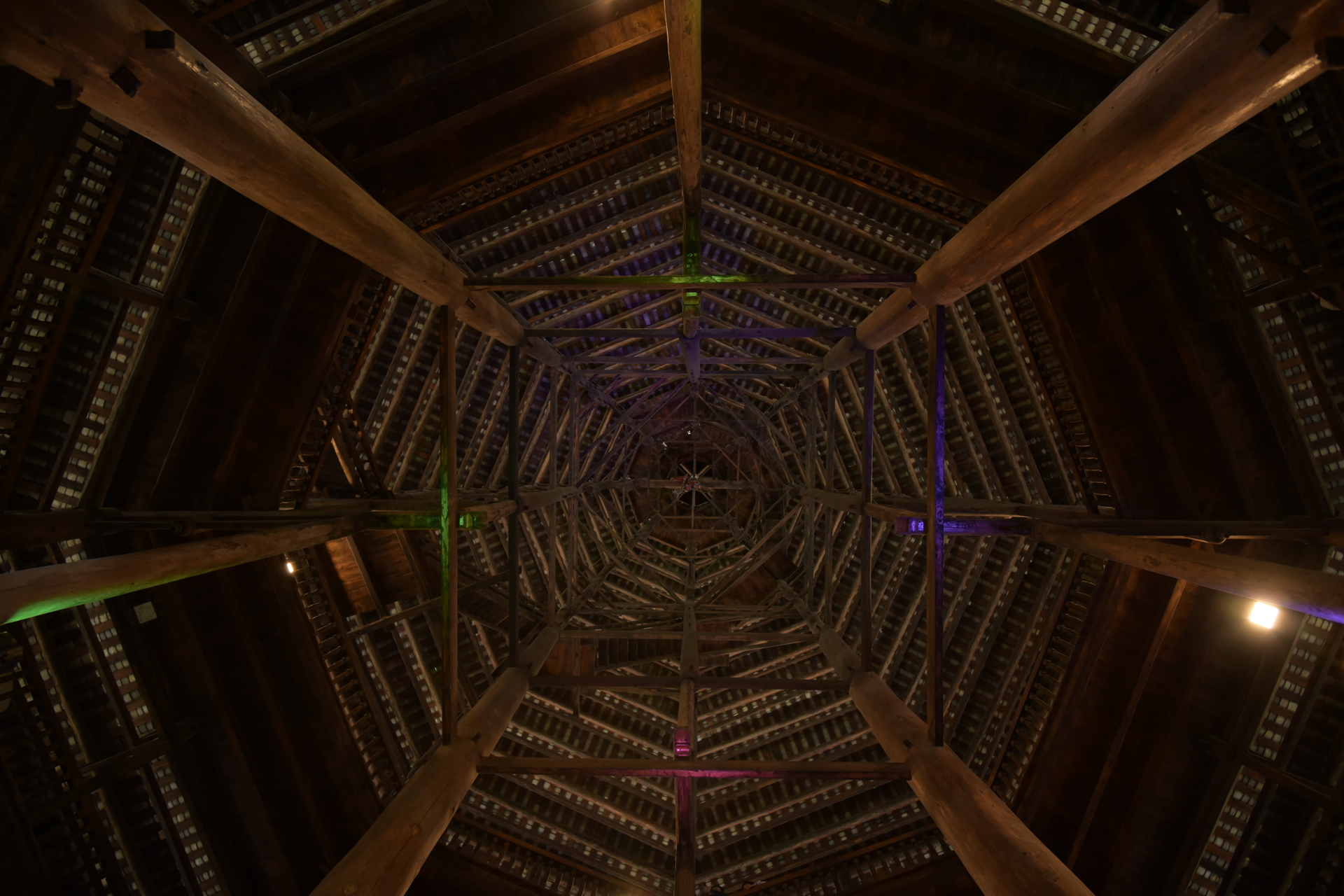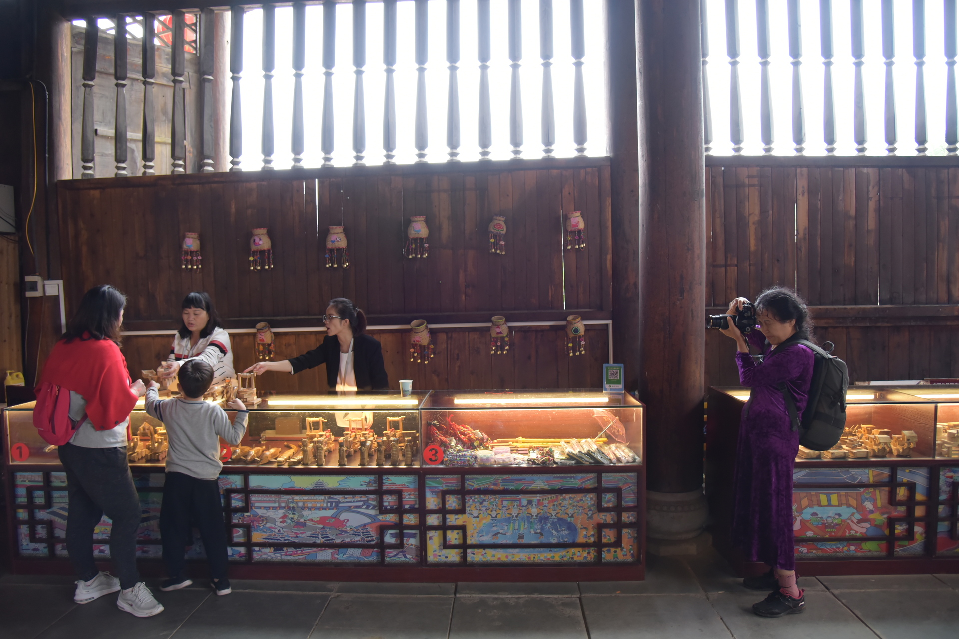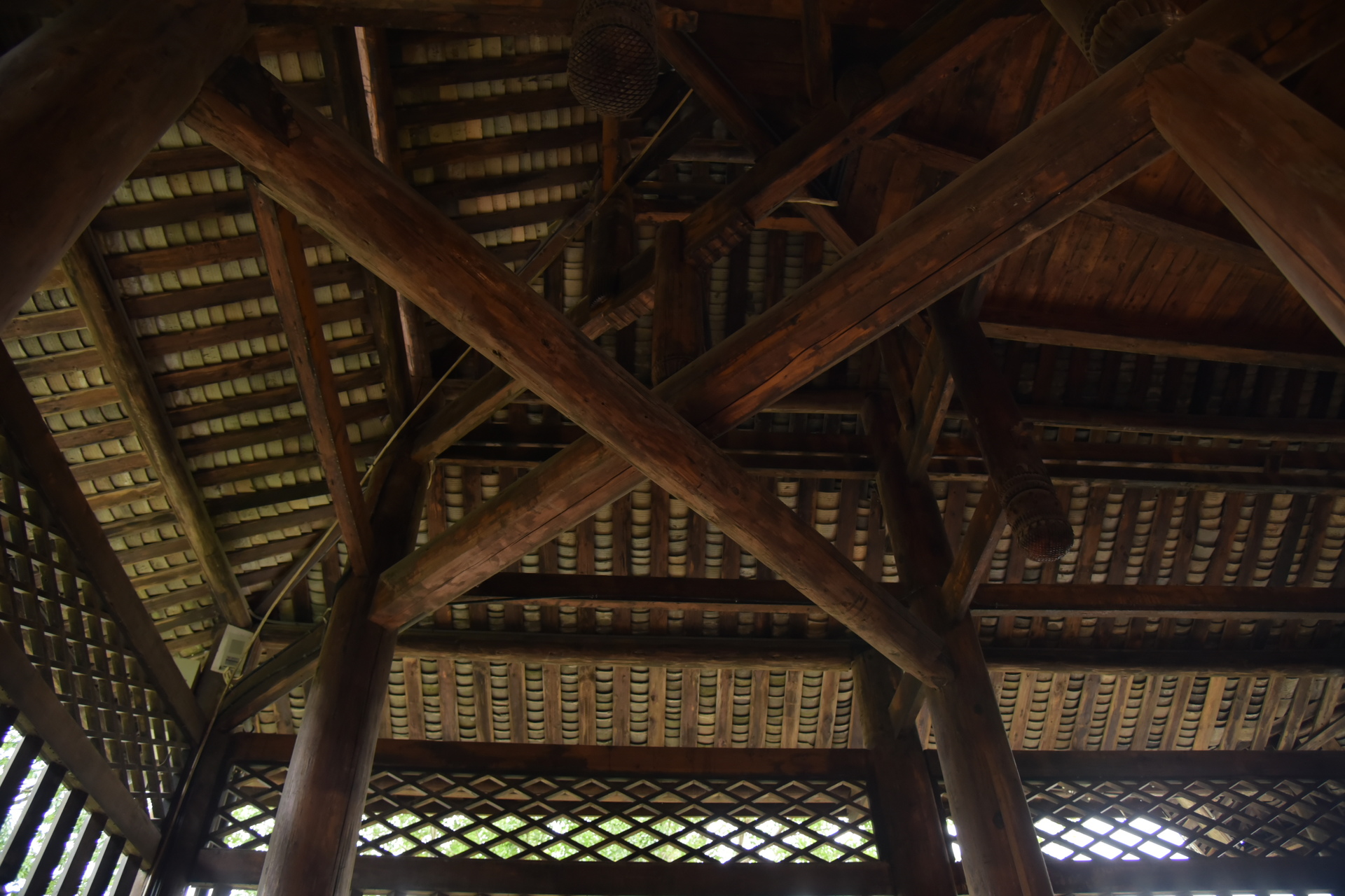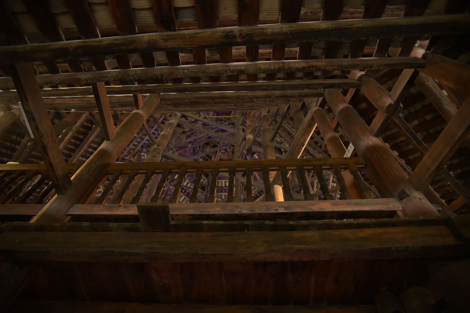 三江鼓楼高42.6米,共有60根柱头着地,占地面积600平方米。鼓楼共有27层瓦檐,除楼顶两层外,其余25层瓦面等距收分,层层紧缩,使楼面呈金字塔形,显得端庄平稳。每层檐角轻盈起翘,精巧的雕饰以及鲜艳的檐板彩绘,与庞大、粗犷的楼身形成鲜明对比。楼内四根杉木大柱直径都超过70厘米,树龄均在百年以上,这在鼓楼建筑史上是唯一的。登上鼓楼的观礼台,三江全景尽收眼底。