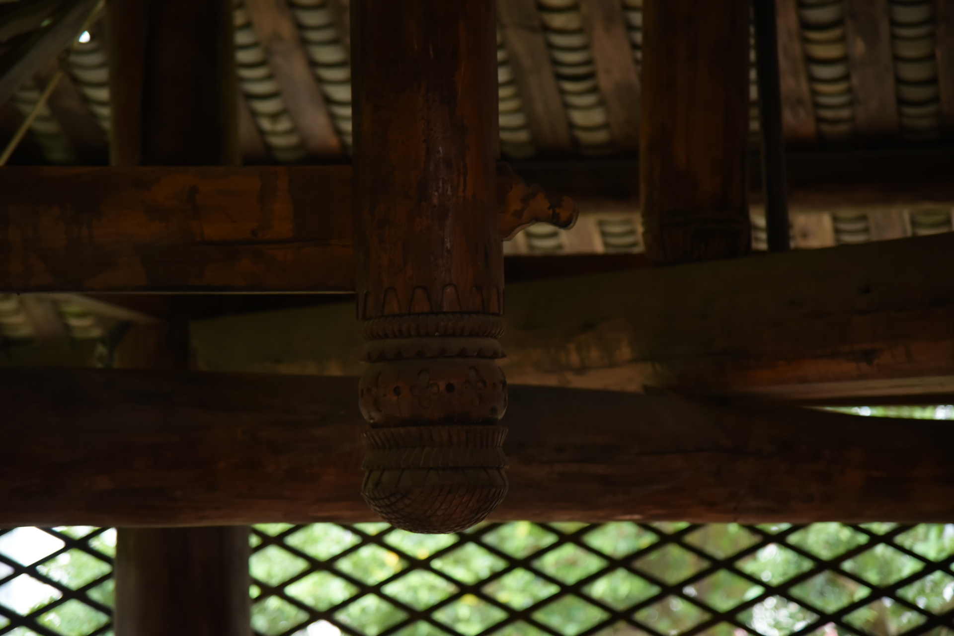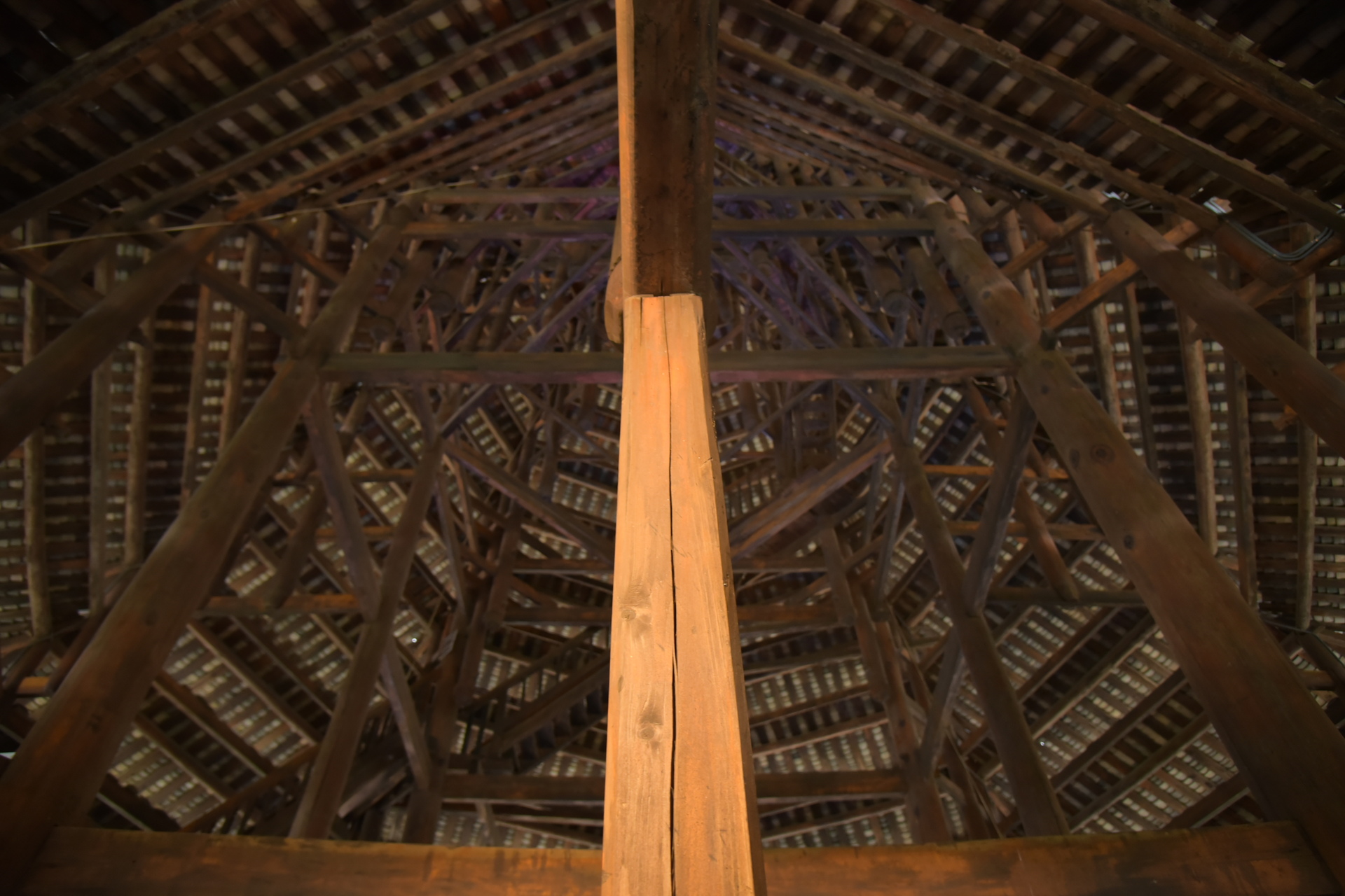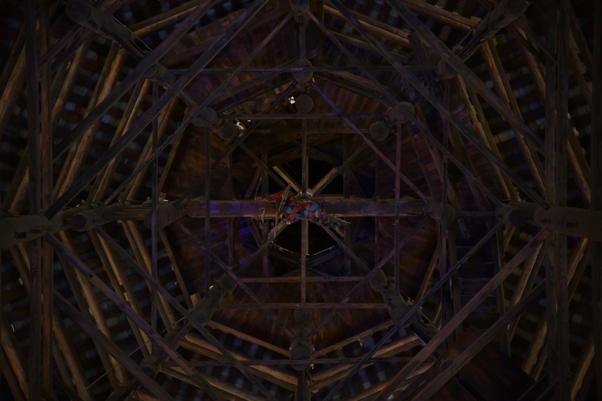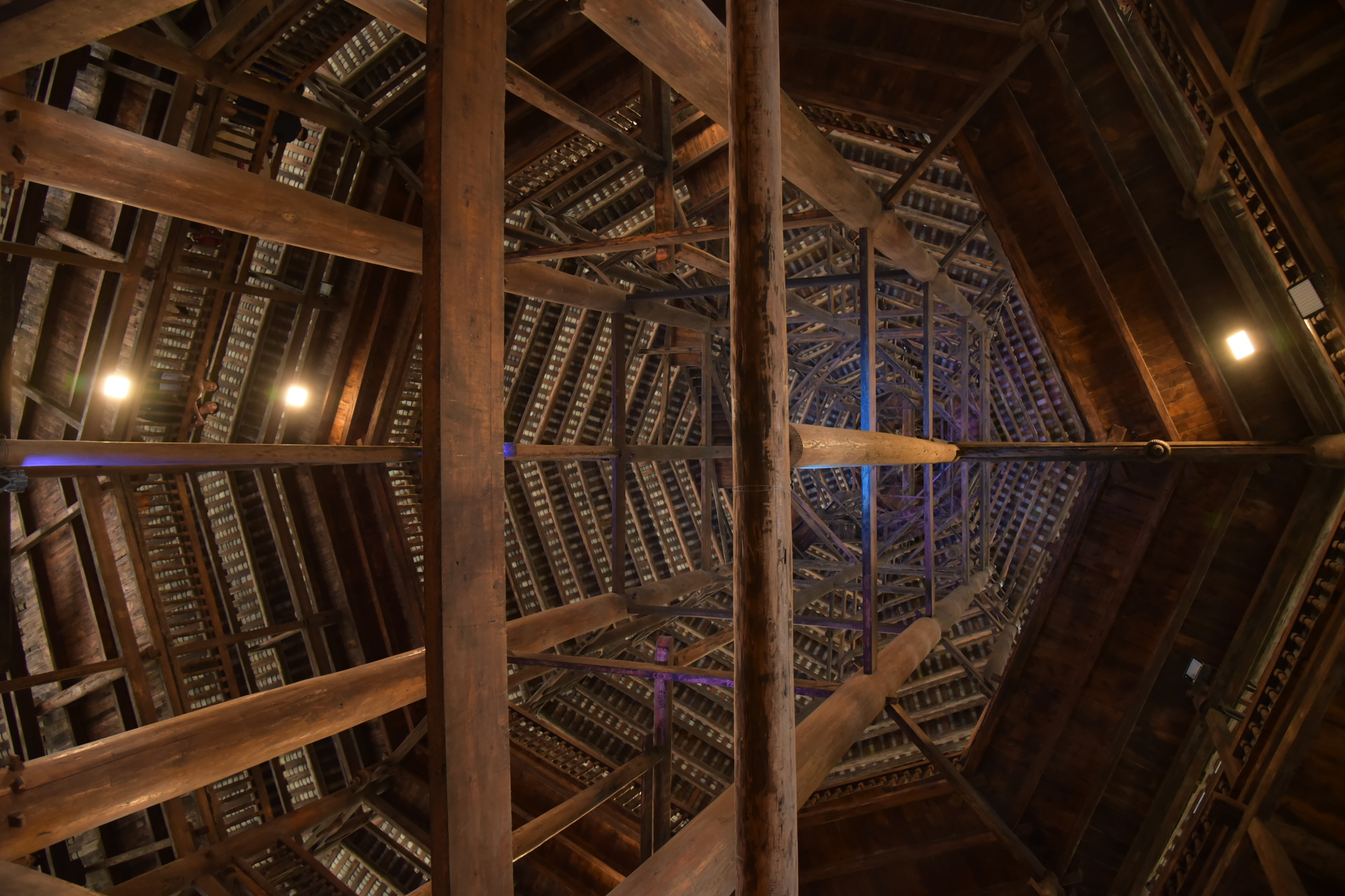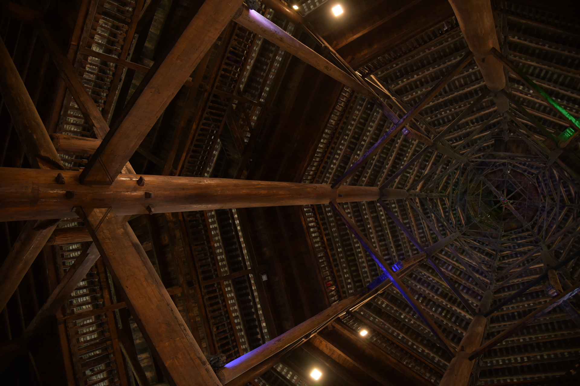 三江鼓楼高42.6米,共有60根柱头着地,占地面积600平方米。鼓楼共有27层瓦檐,除楼顶两层外,其余25层瓦面等距收分,层层紧缩,使楼面呈金字塔形,显得端庄平稳。每层檐角轻盈起翘,精巧的雕饰以及鲜艳的檐板彩绘,与庞大、粗犷的楼身形成鲜明对比。楼内四根杉木大柱直径都超过70厘米,树龄均在百年以上,这在鼓楼建筑史上是唯一的。登上鼓楼的观礼台,三江全景尽收眼底。